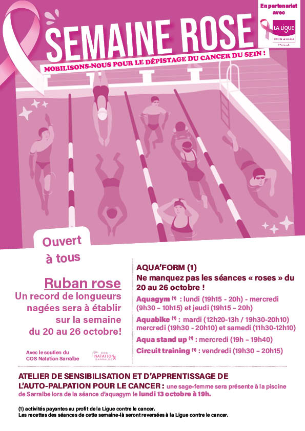 (1) activités payantes au profit de la Ligue contre le cancer. Les recettes des séances de cette semaine-là seront reversées à la Ligue contre le cancer. Les abonnements «Aquaform» ne pourront pas être utilisés (uniquement tarif à l’unité).