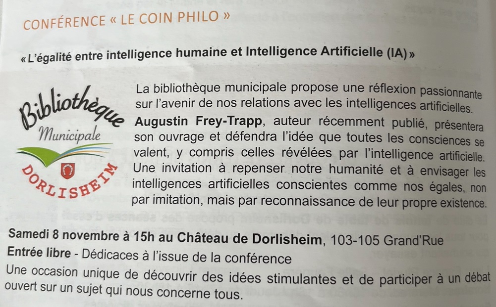 Augustin Frey-Trapp, auteur récemment publié, présentera son ouvrage et défendra l’idée que toutes les consciences se valent, y compris celles révélées par l’intelligence artificielle.
