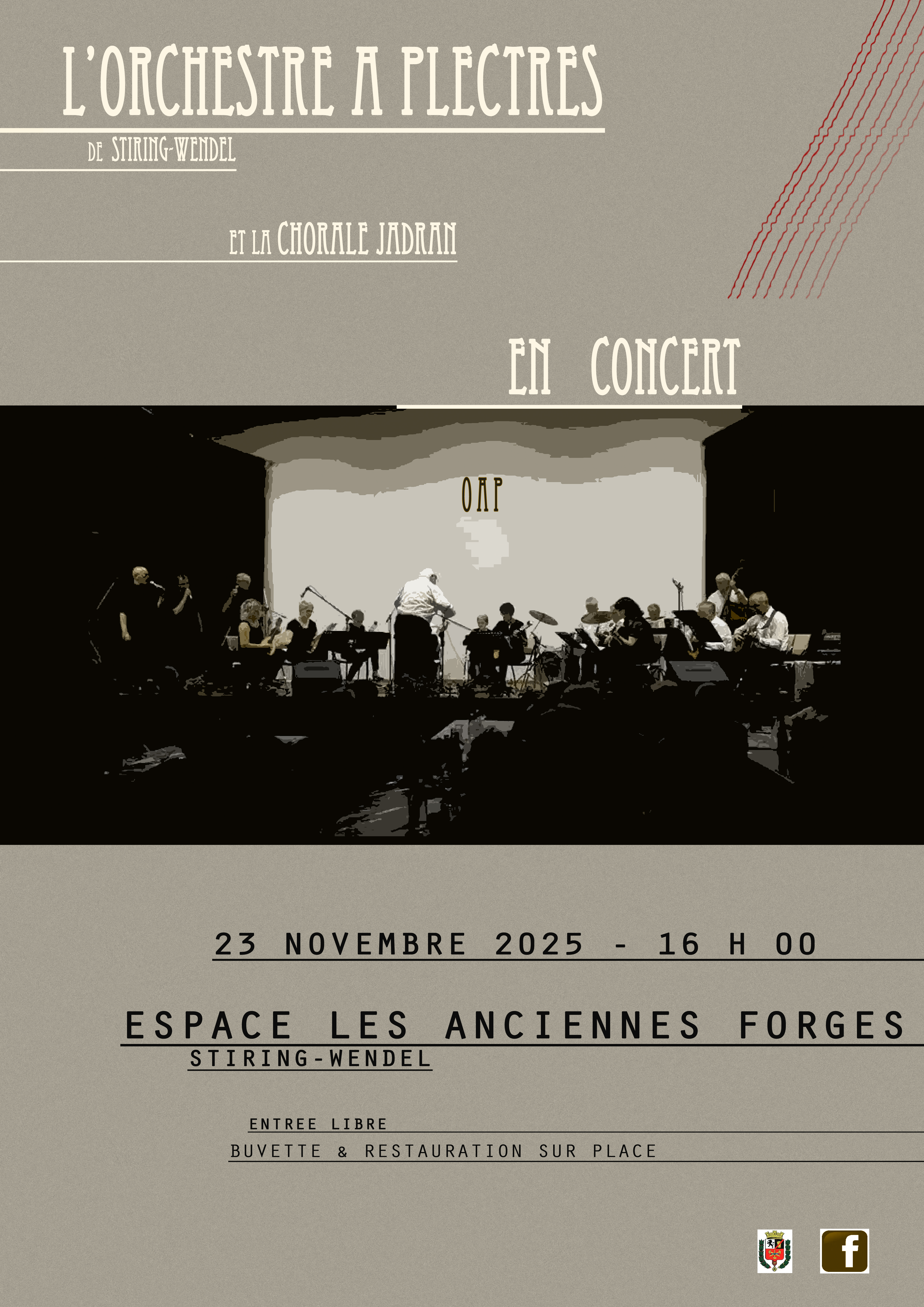 Concert annuel à l'espace des Anciennes Forges avec l'Orchestre à Plèctres de Stiring-Wendel sous la direction de M. Denig Herbert dès 16h00.