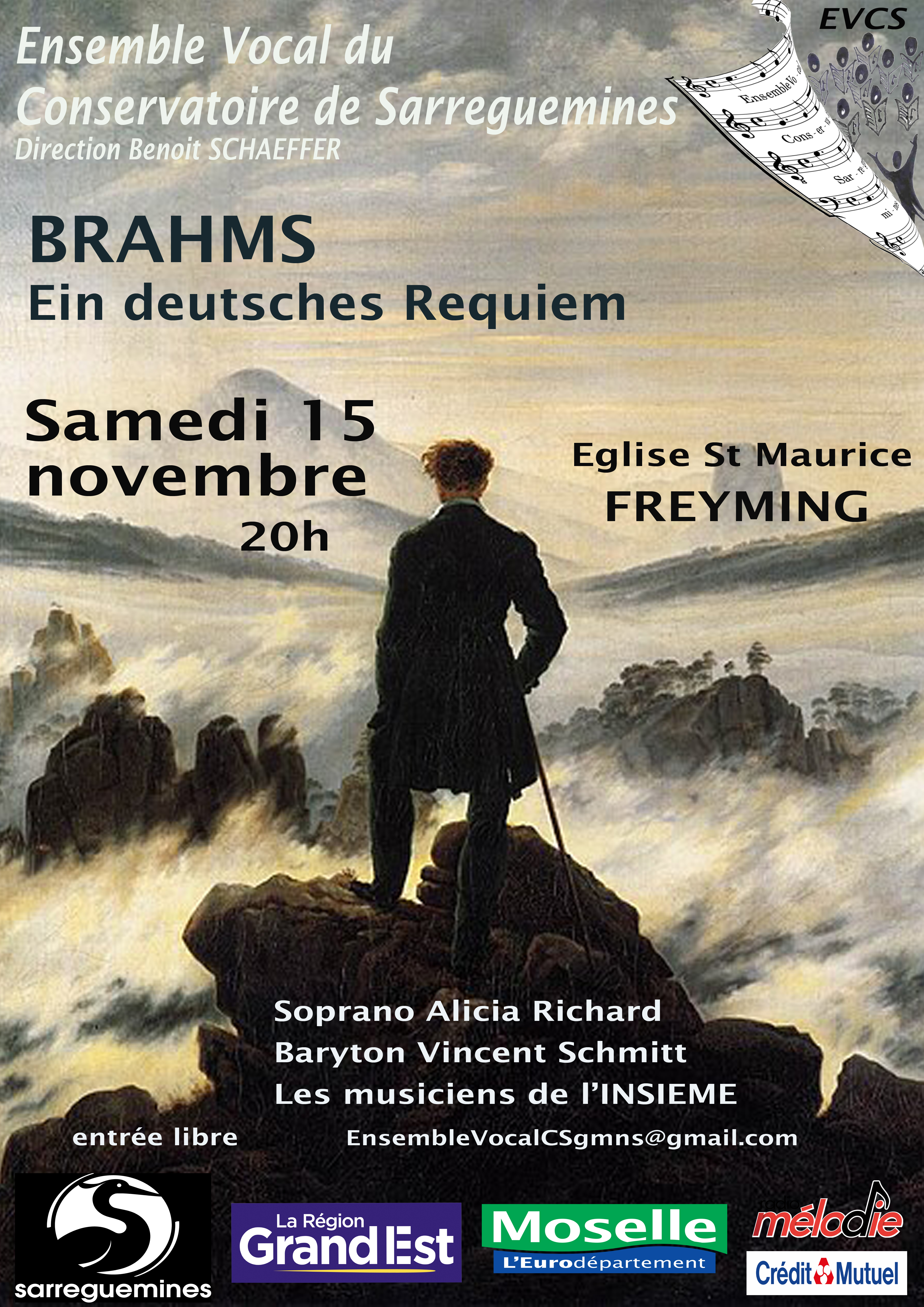 Les choristes de l'Ensemble Vocal du conservatoire de Sarreguemines et les musiciens de l'Insieme vous invitent à la représentation du programme musical de cette année : le Requiem allemand de Johannes Brahms, le samedi 15 novembre à 20h à l'église Saint-Maurice de Freyming-Merlebach.