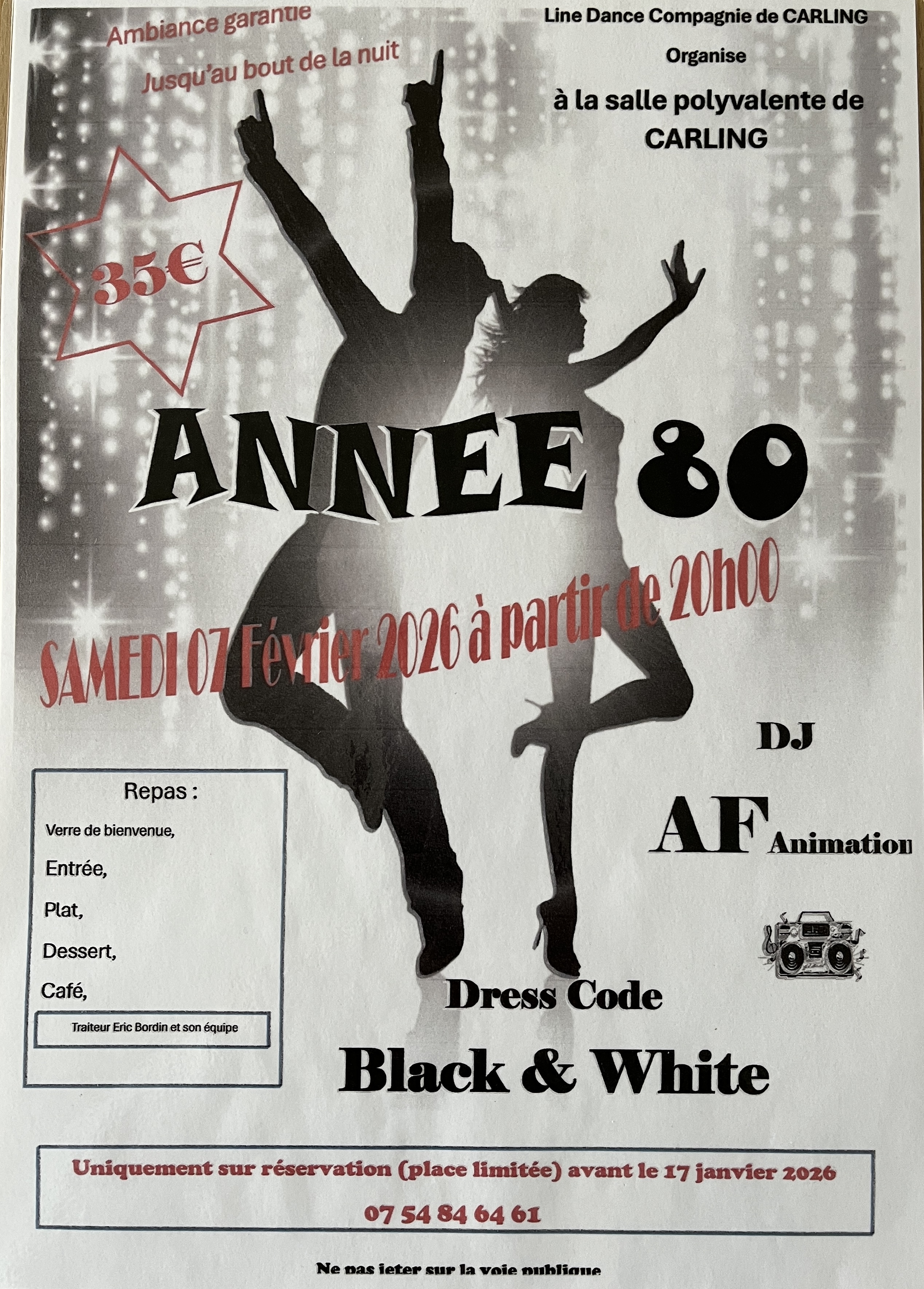 Nous organisons pour la deuxième année une soirée année 80 à la salle des fêtes de Carling animée par DJ AF Animation avec un repas entrée plats dessert café le samedi 07 février 2026 réservations au 07 54 84 64 61.