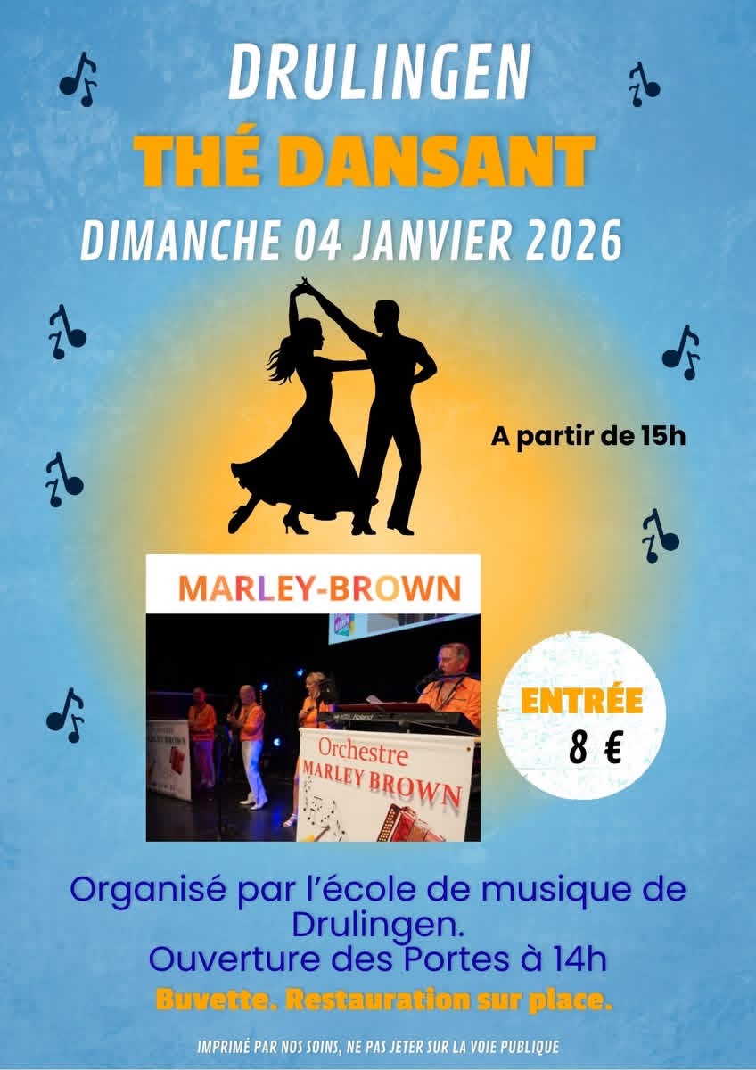 L’école de musique de Drulingen organise un thé dansant le dimanche 04 janvier à la salle des fêtes de Drulingen. Animation par l’orchestre « Marley Brown ». Ouverture des portes à partir de 14h. Entrée 8€. Petite restauration et buvette sur place.