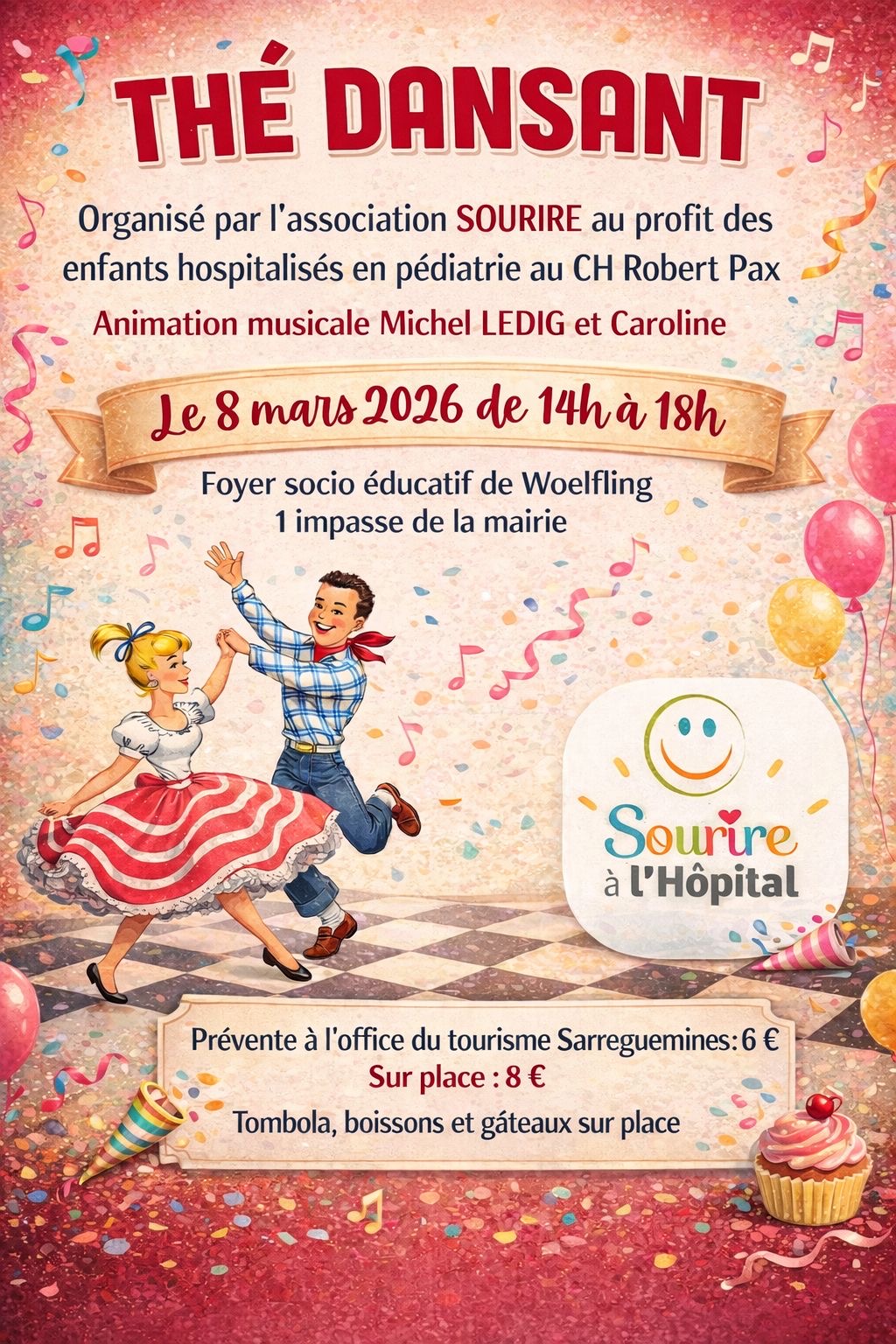 L'association Sourire a l'hôpital organise un thé dansant dimanche 8 mars 2026 de 14h à 18h à Woelfing les Sarreguemines au foyer Socio éducatif, 1 impasse de la la Mairie.