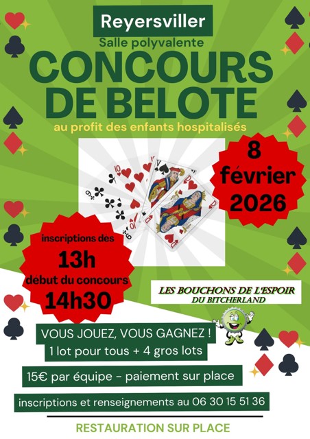 Les bouchons de l’espoir du Bitcherland organise son premier tournoi de belote le 8 février prochain dans la salle polyvalente de Reyersviller.