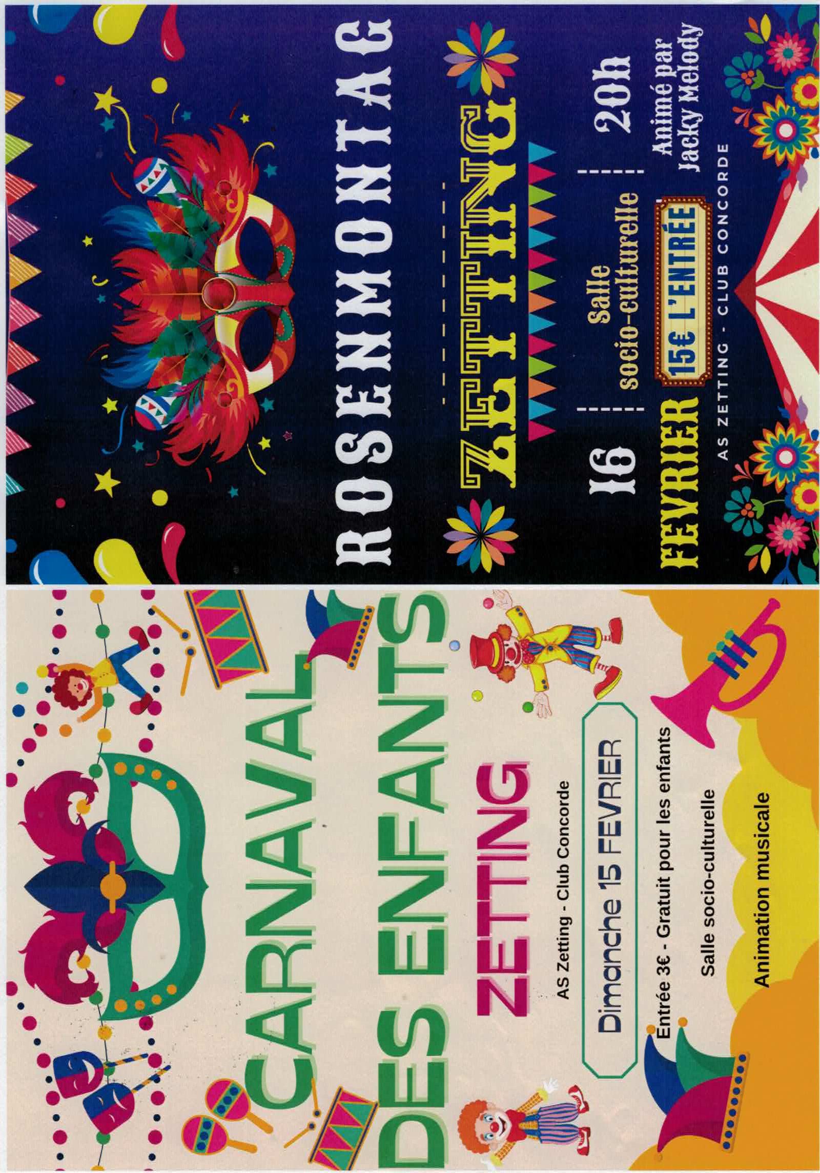 L'AS Zetting et le Club Concorde vous invitent à son carnaval des enfants le dimanche 15 février à partir de 14h à la salle socio-culturelle de Zetting avec animation musicale.