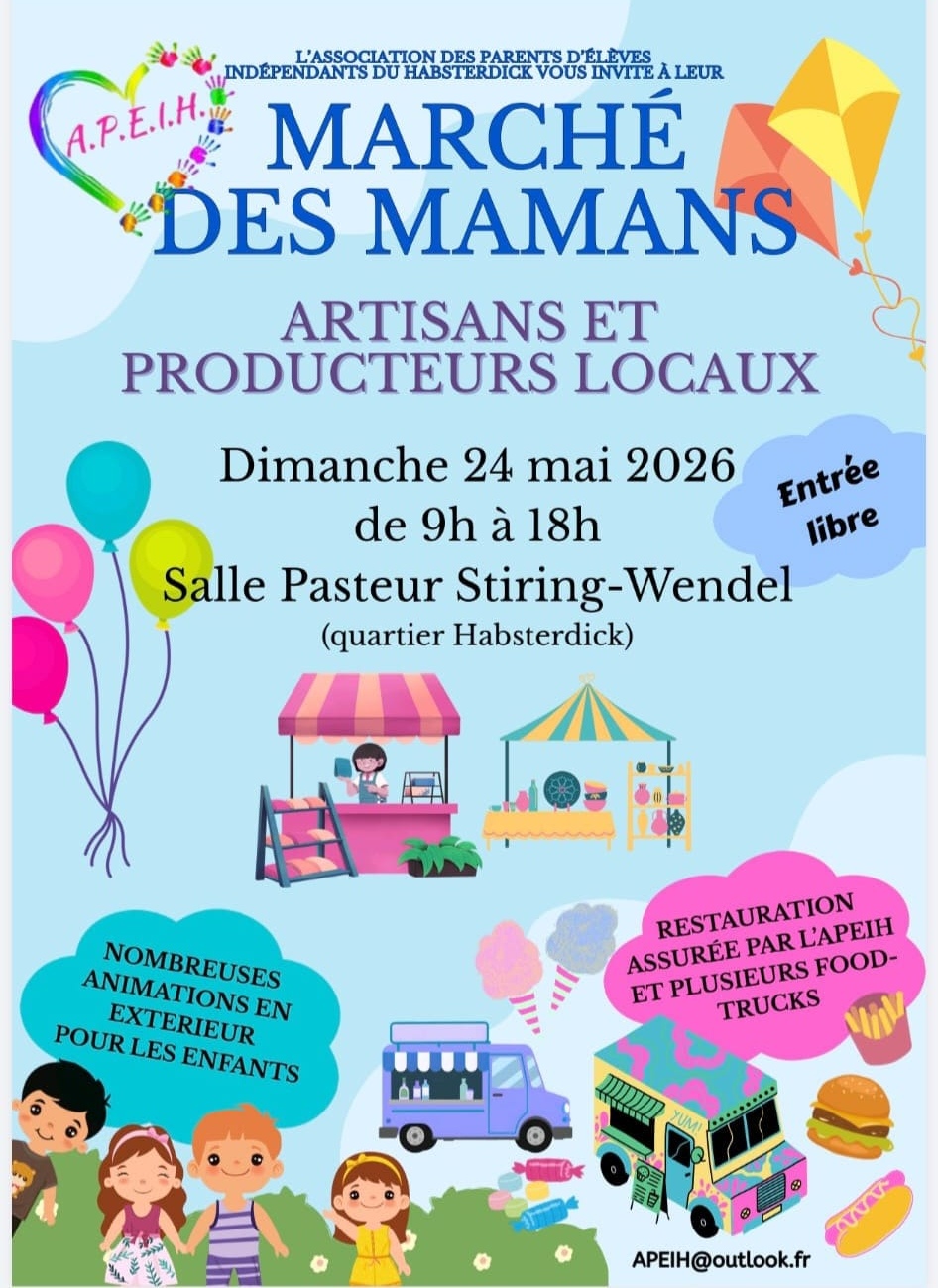 Les mamans de l'APEIH (Association des Parents d'Elèves Indépendants du Habsterdick) de Stiring-Wendel organisent un "Marché des Mamans" le dimanche 24 mai 2026 avec artisans et producteurs locaux, animations pour enfants à l'extérieur.