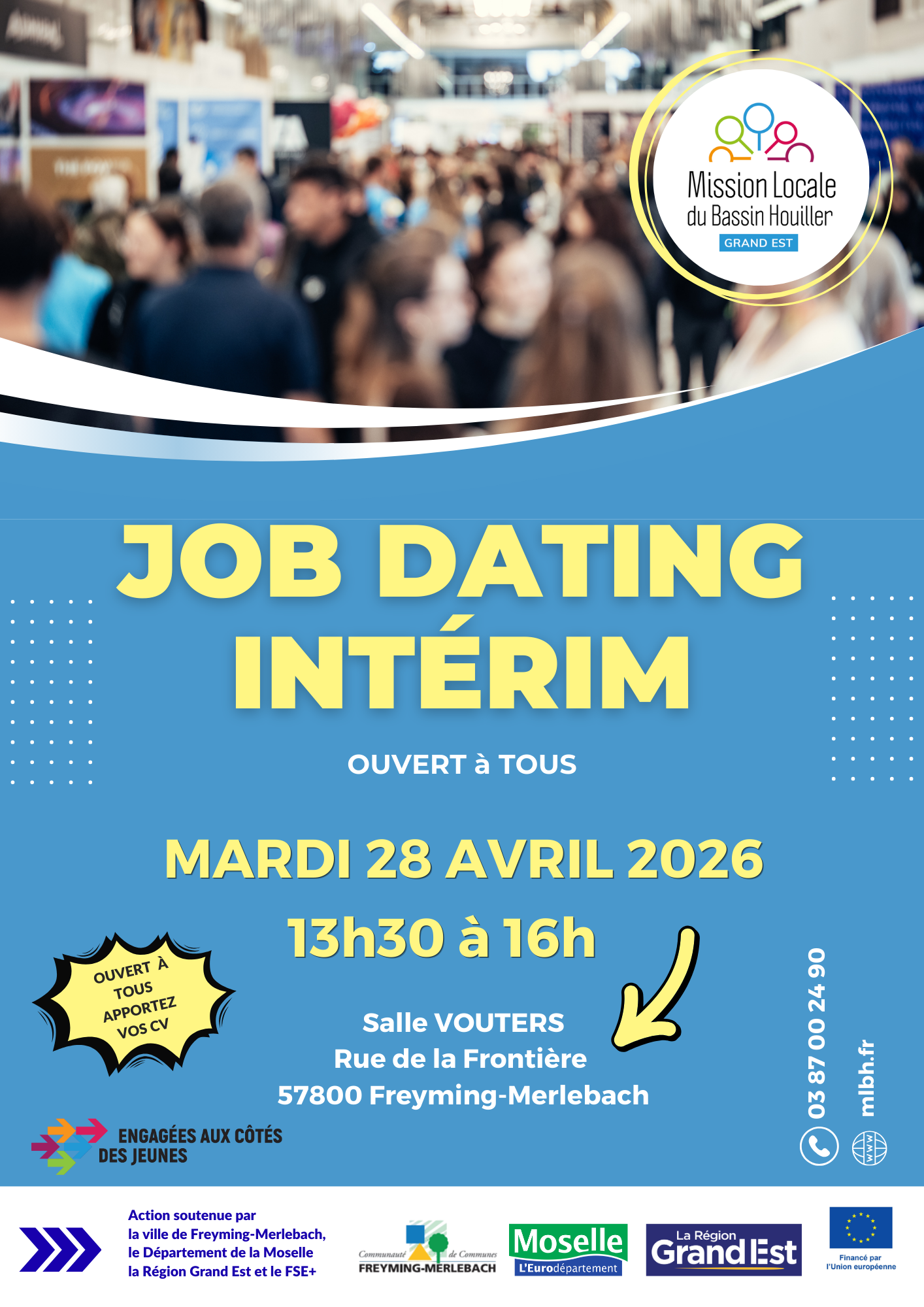La Mission Locale du Bassin Houiller organise un JOB DATING INTERIM mardi 28 avril 2026 de 13h30 à 16h00