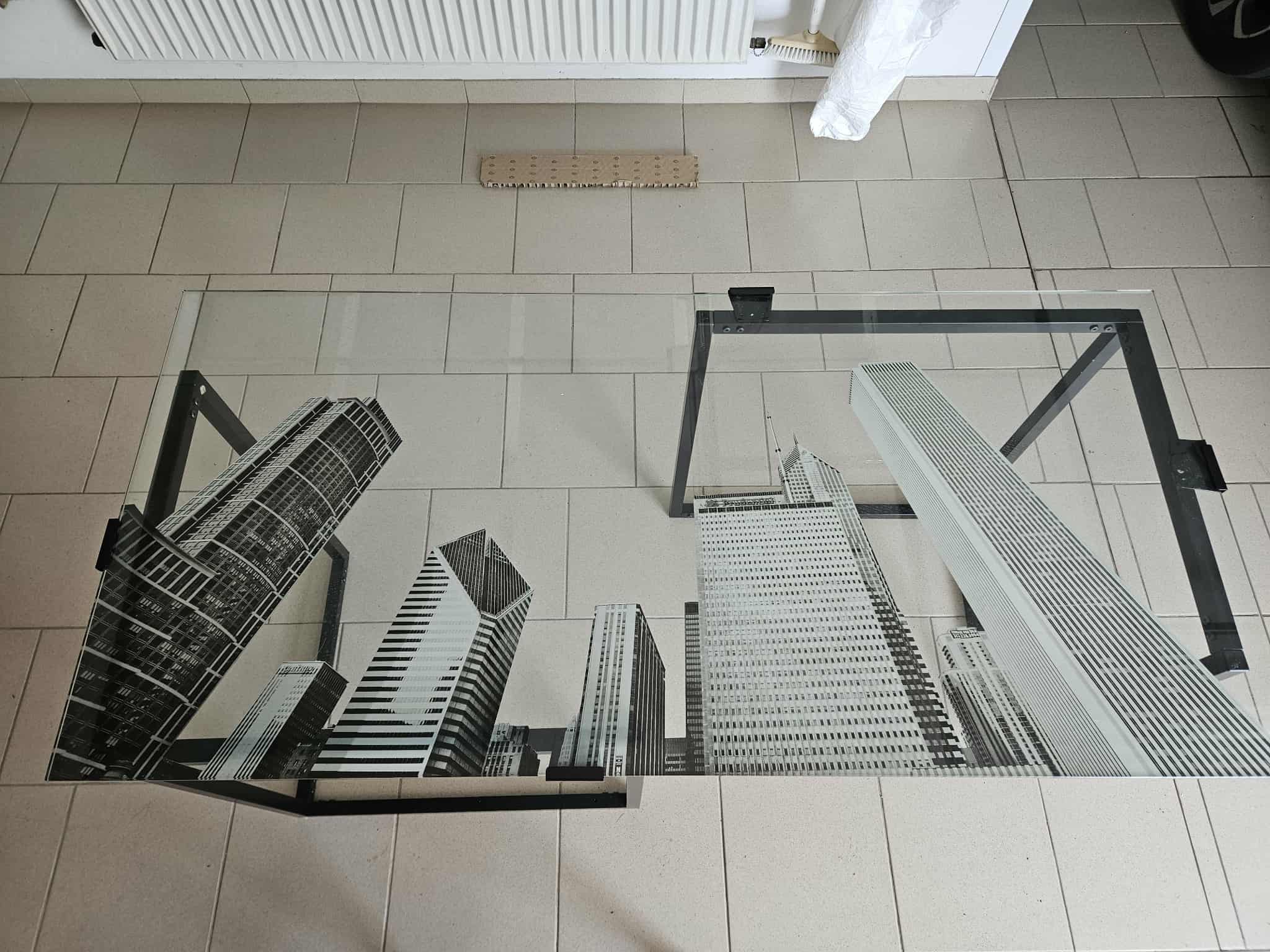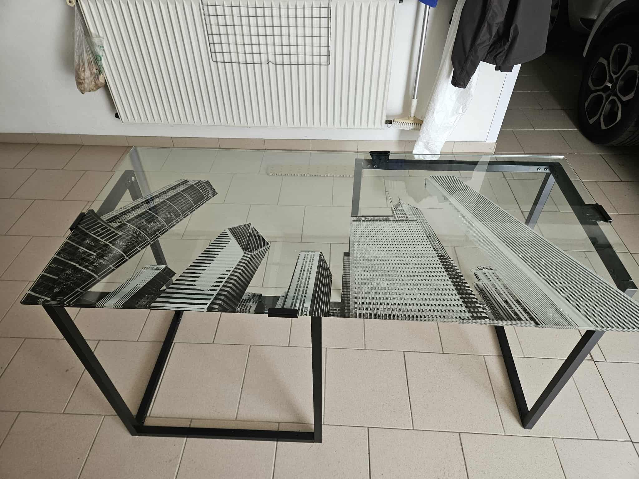 Je vends ce bureau design avec un plateau en verre imprimé de gratte-ciels new-yorkais. - Type de produit : Bureau