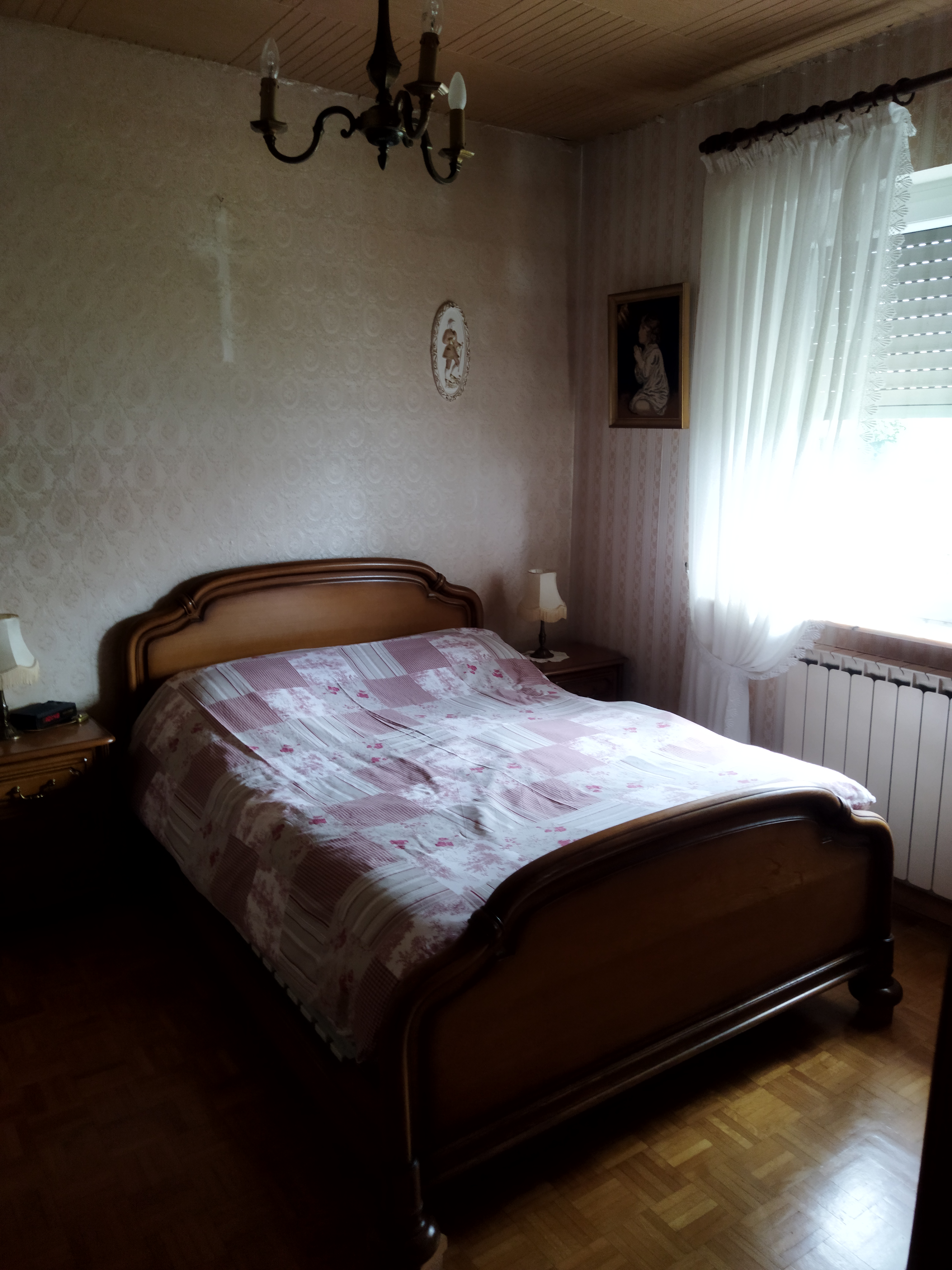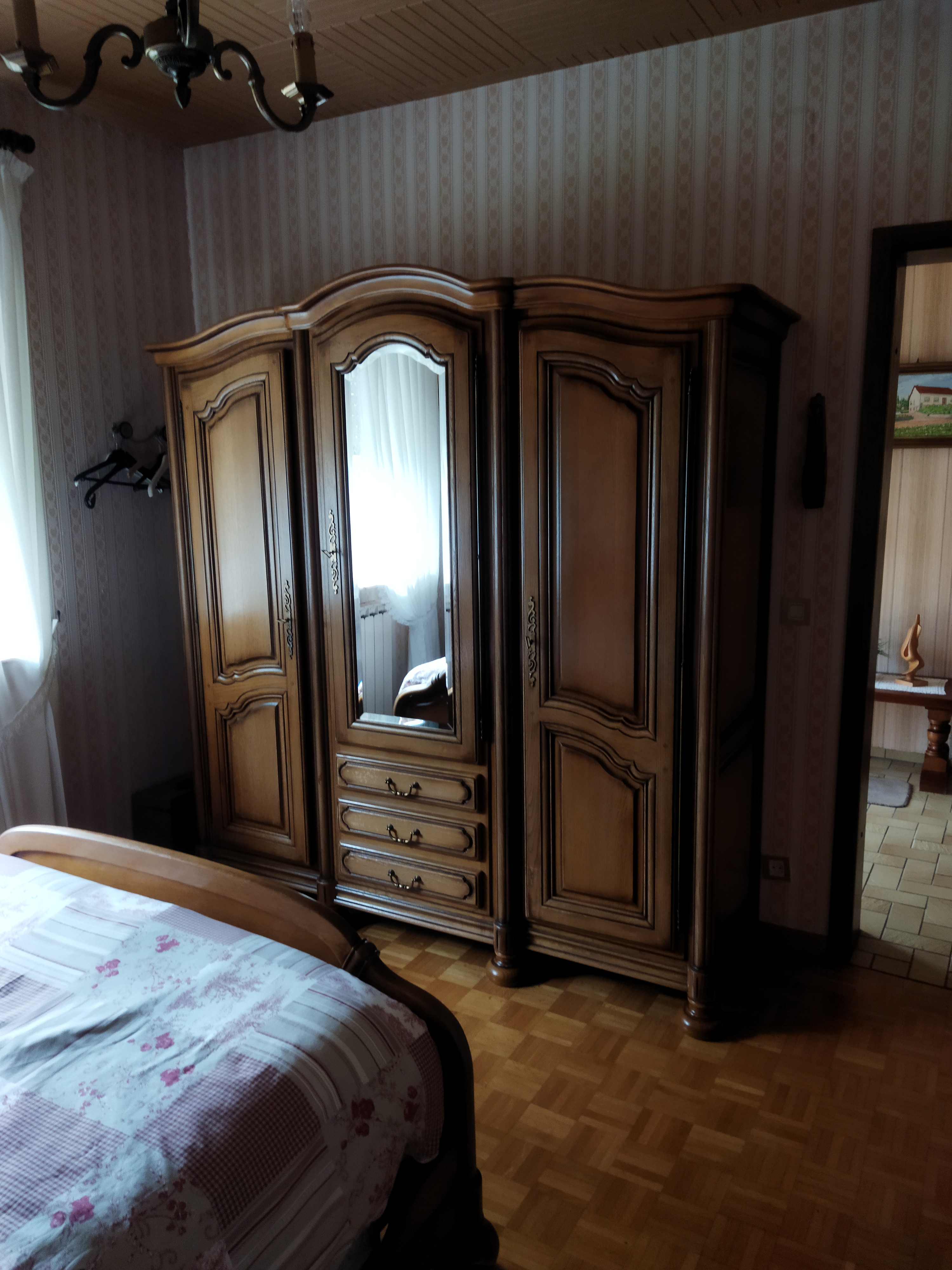 Armoire (penderie, étagères et tiroirs), lit 2 personnes, commode, 2 chevets. Chêne clair.