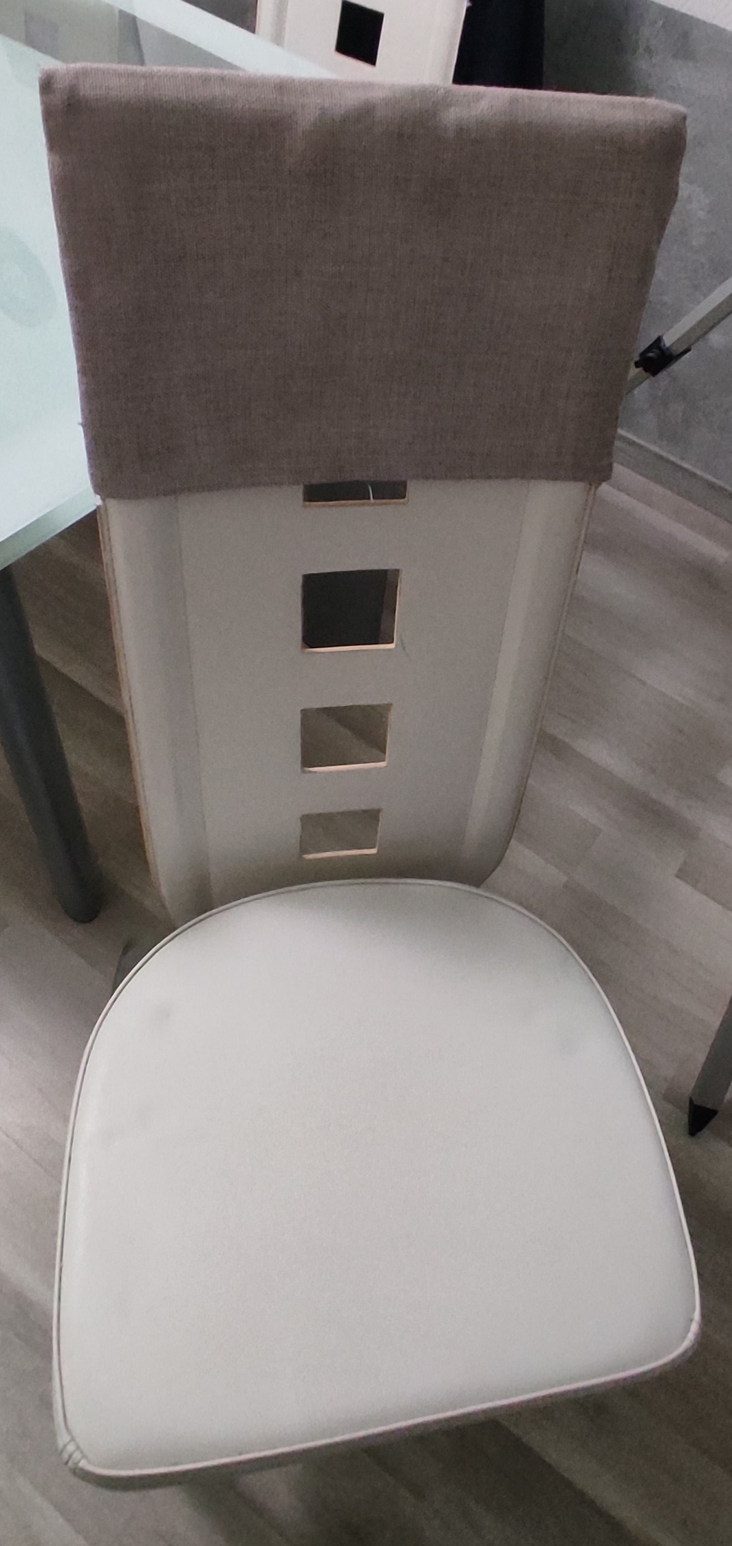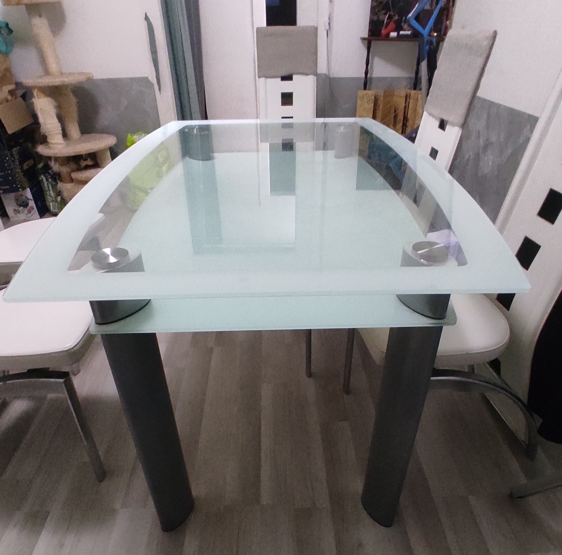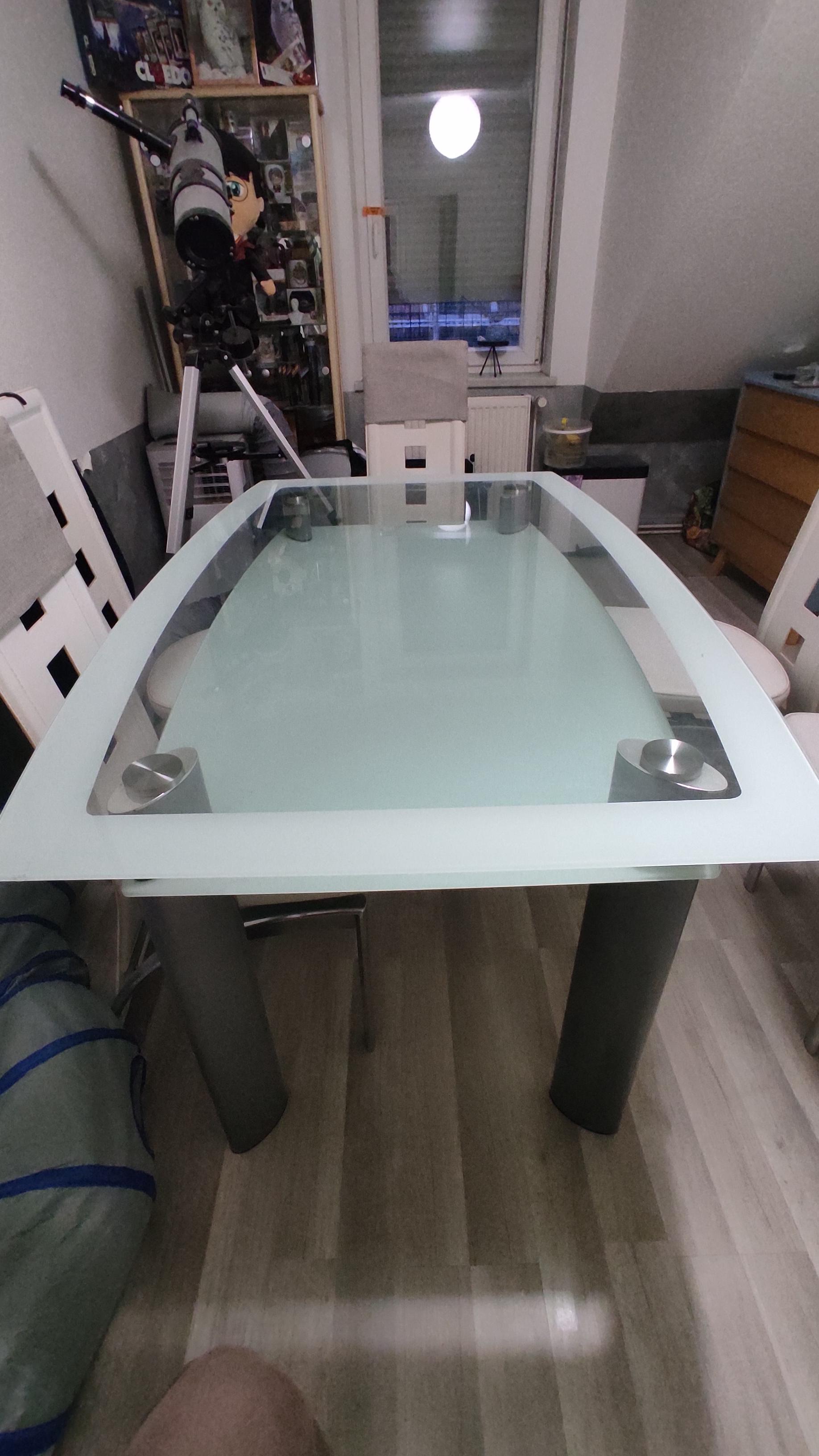 Grande table en verre, pouvant accueillir jusqu'à 6 personnes. Elle est en bon état général, mais présente quelques signes d'usure. Les 6 chaises sont légèrement abîmées par les griffes de chats, mais restent confortables. Prix de l'ensemble : 150 euros, négociable.