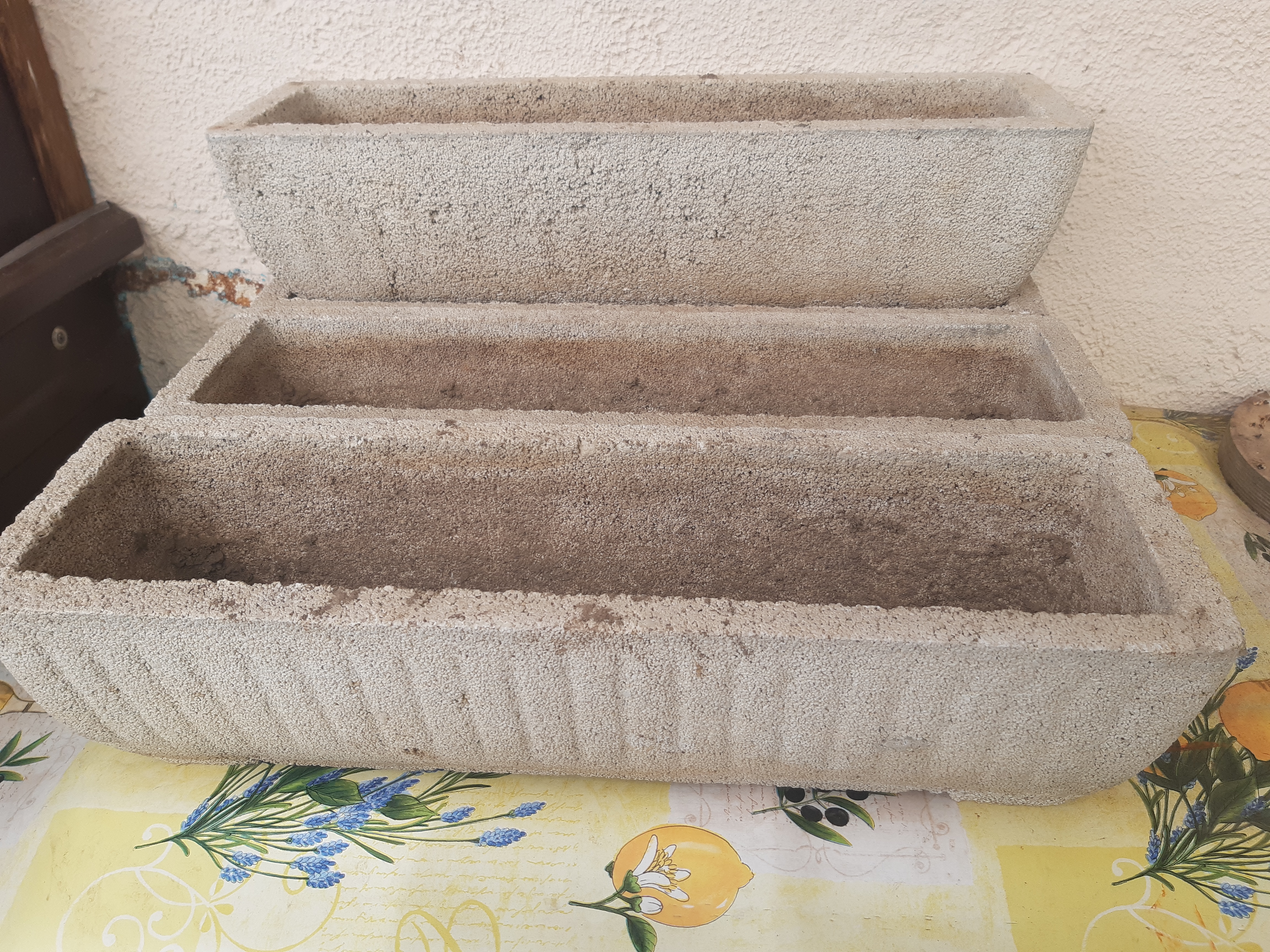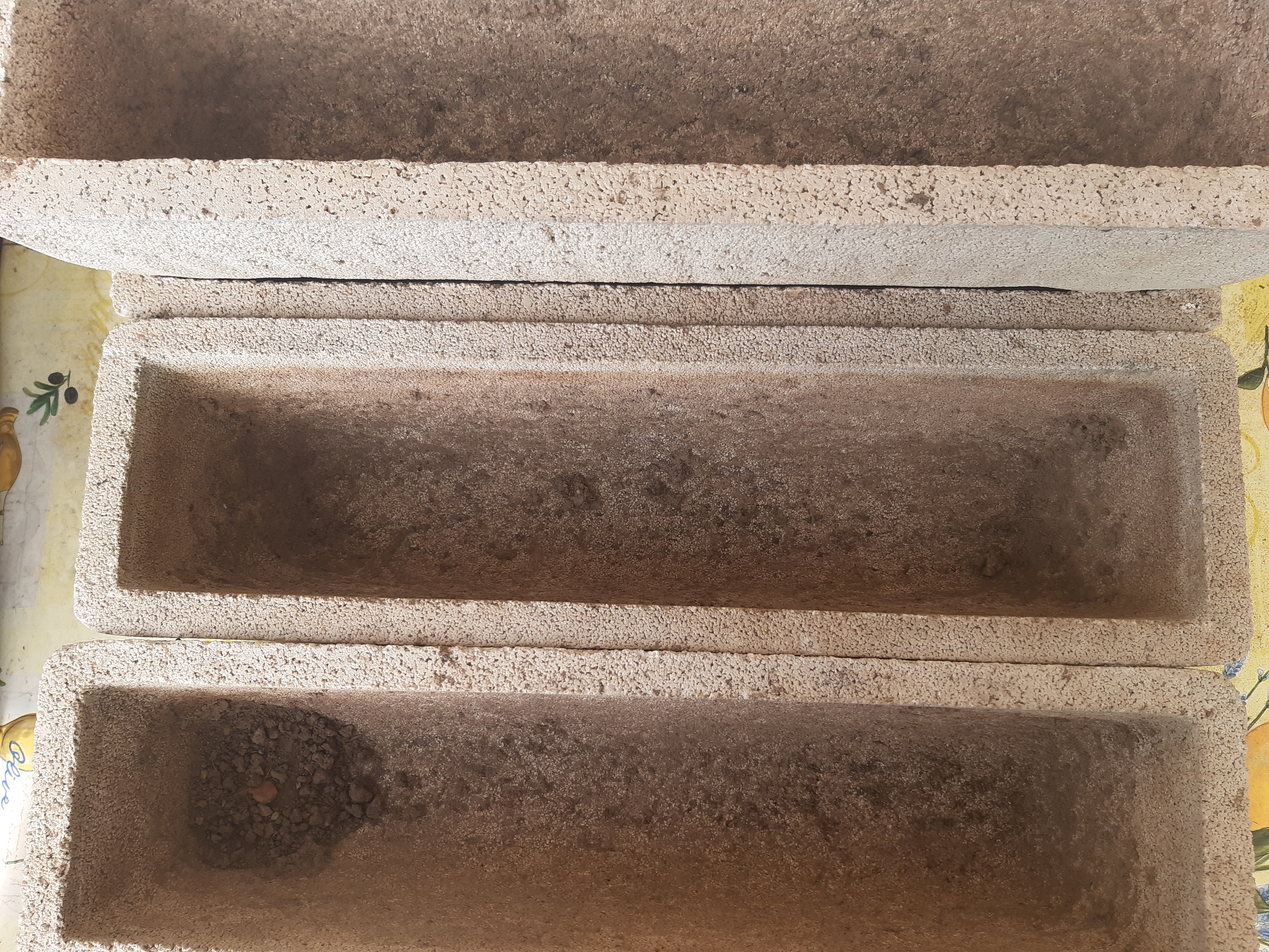 4 jardinières en pierre de 60 cm sur 17 cm et sur 16 cm de haut acheté l'année dernière comme neuf
