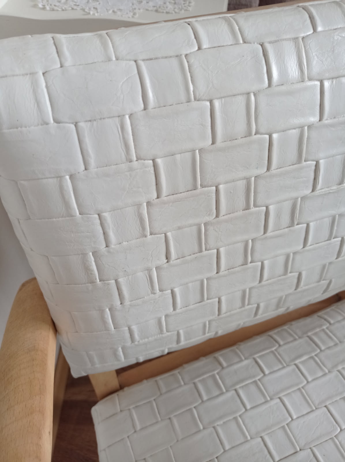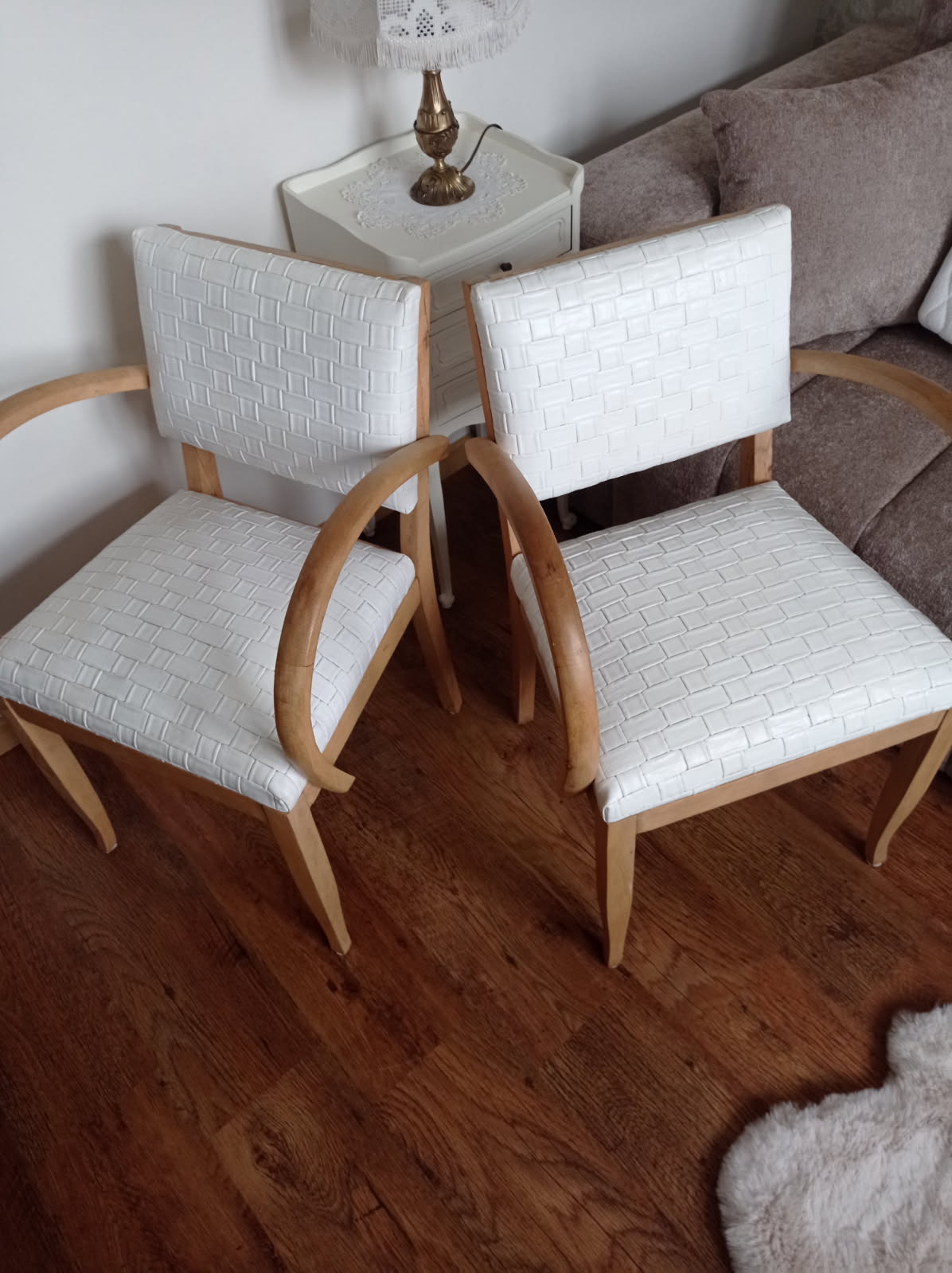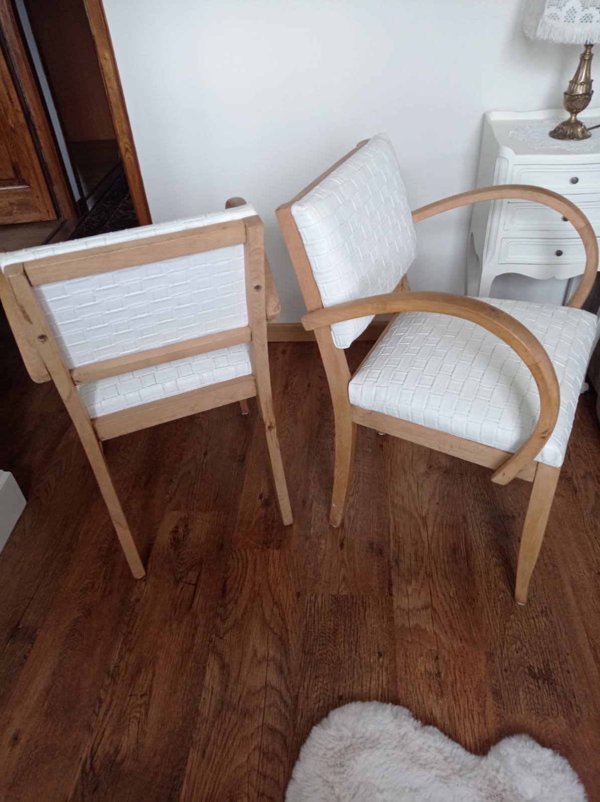Paire de fauteuils en simili cuir blanc et chêne