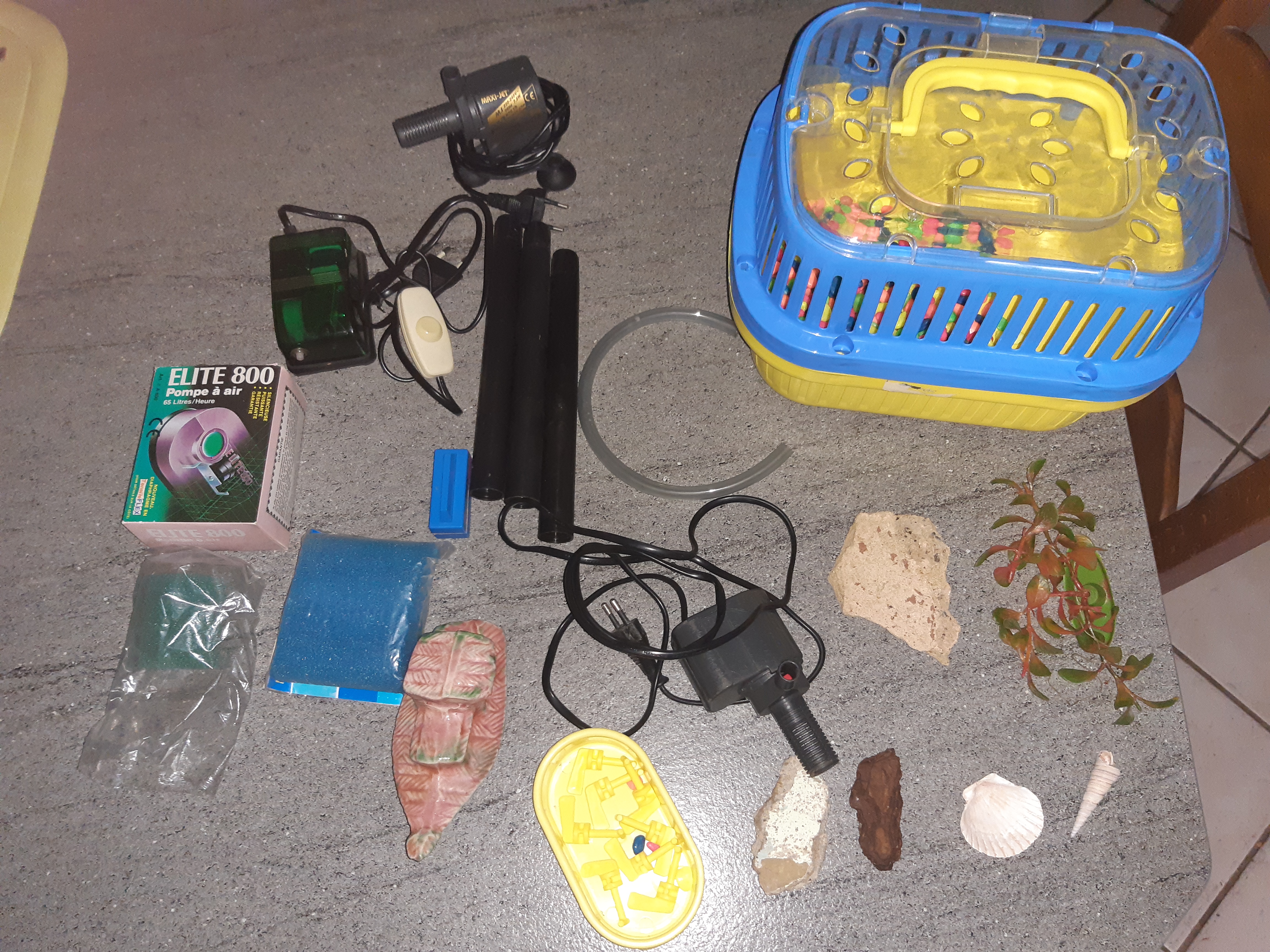 Aquarium en bon état de 40cm de large sur 25cm prof sur 30cm de haut qui servait à 4 poissons rouges avec plusieurs pompes et accessoires comme sur photos