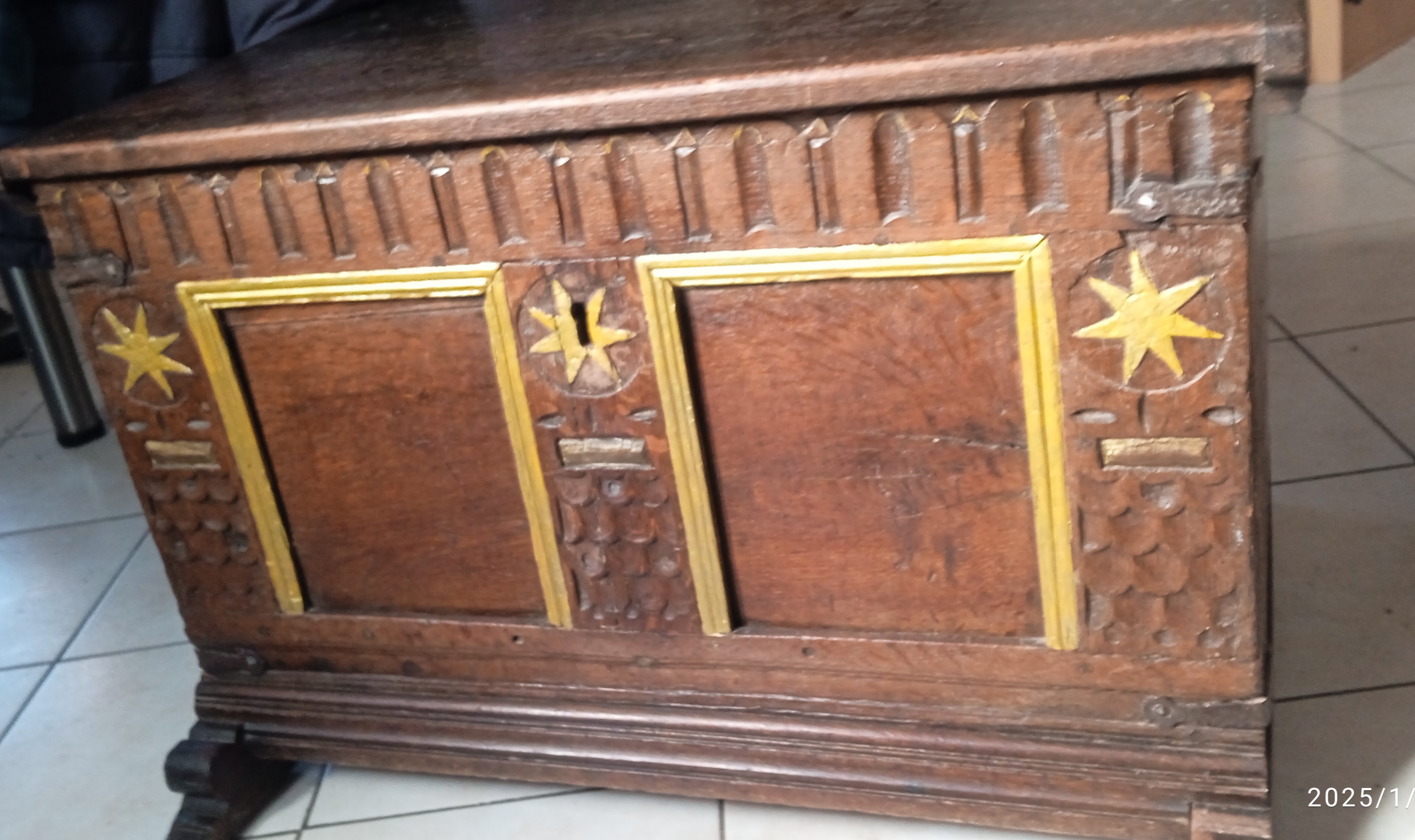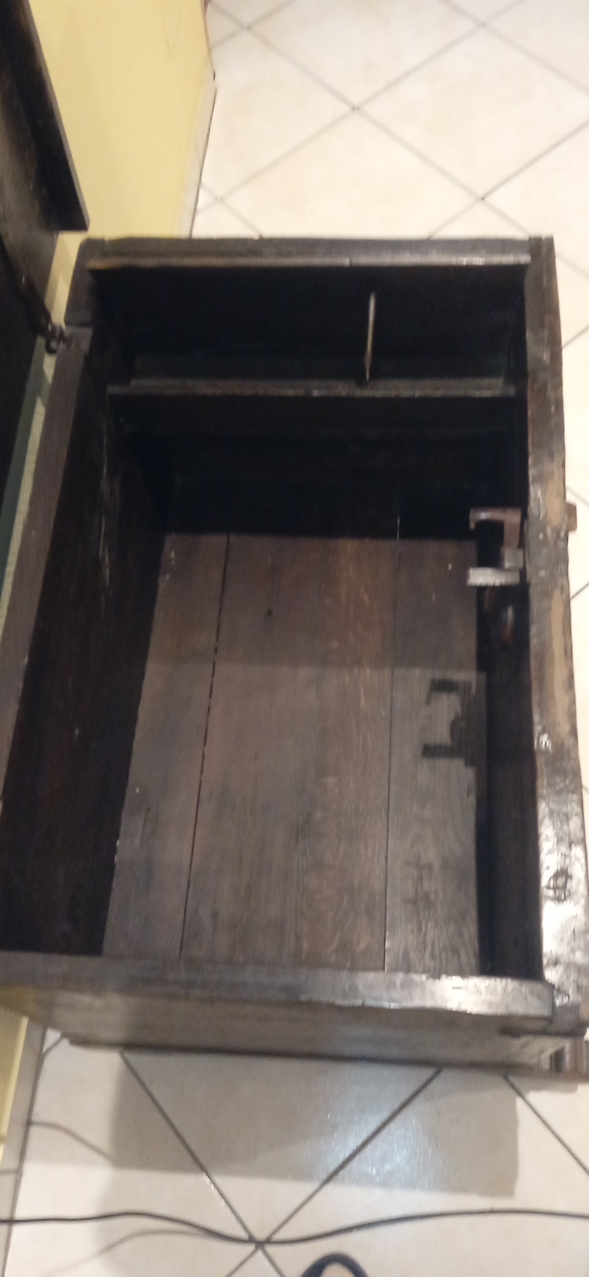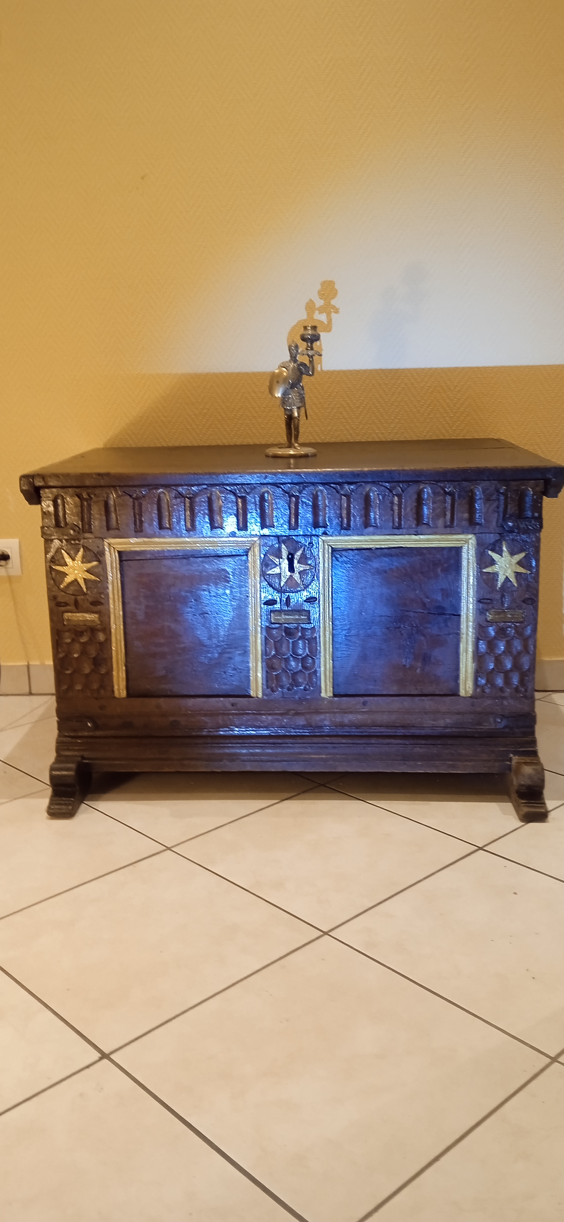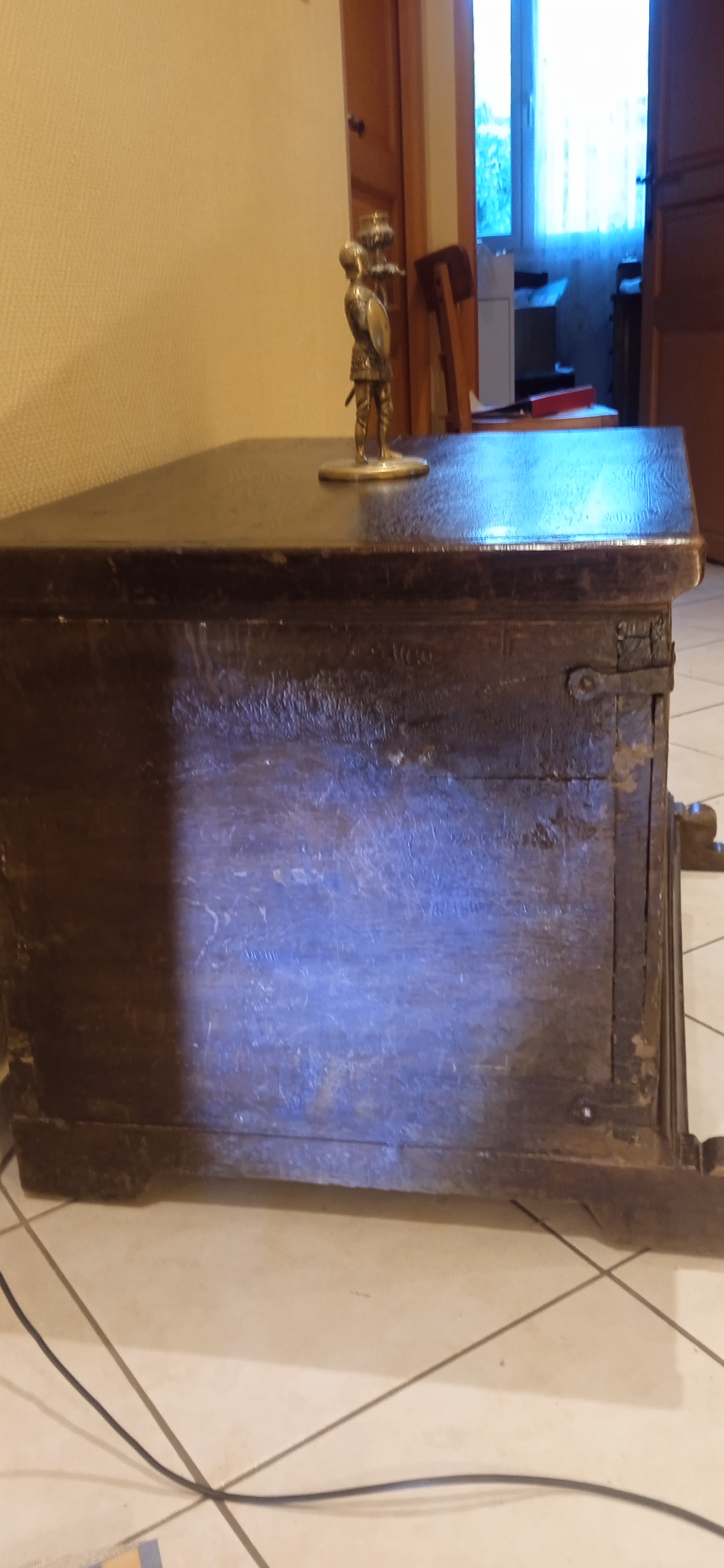 Coffret à l'intérieur et serrure décorative. C'est une pièce unique fait par un ébéniste, c'est une véritable antiquité, pas comme un meuble Henri II (néo-renaissance) produit en série à partir de la fin du 19ème. C'est un meuble de l'ère préindustrielle. Je m'en sépare à regret, mais j'ai hérité d'un autre coffre similaire et la place est limitée. Il peut servir de bar , ou pour stocker affaires d'hiver en été ect... Le prix est négociable.