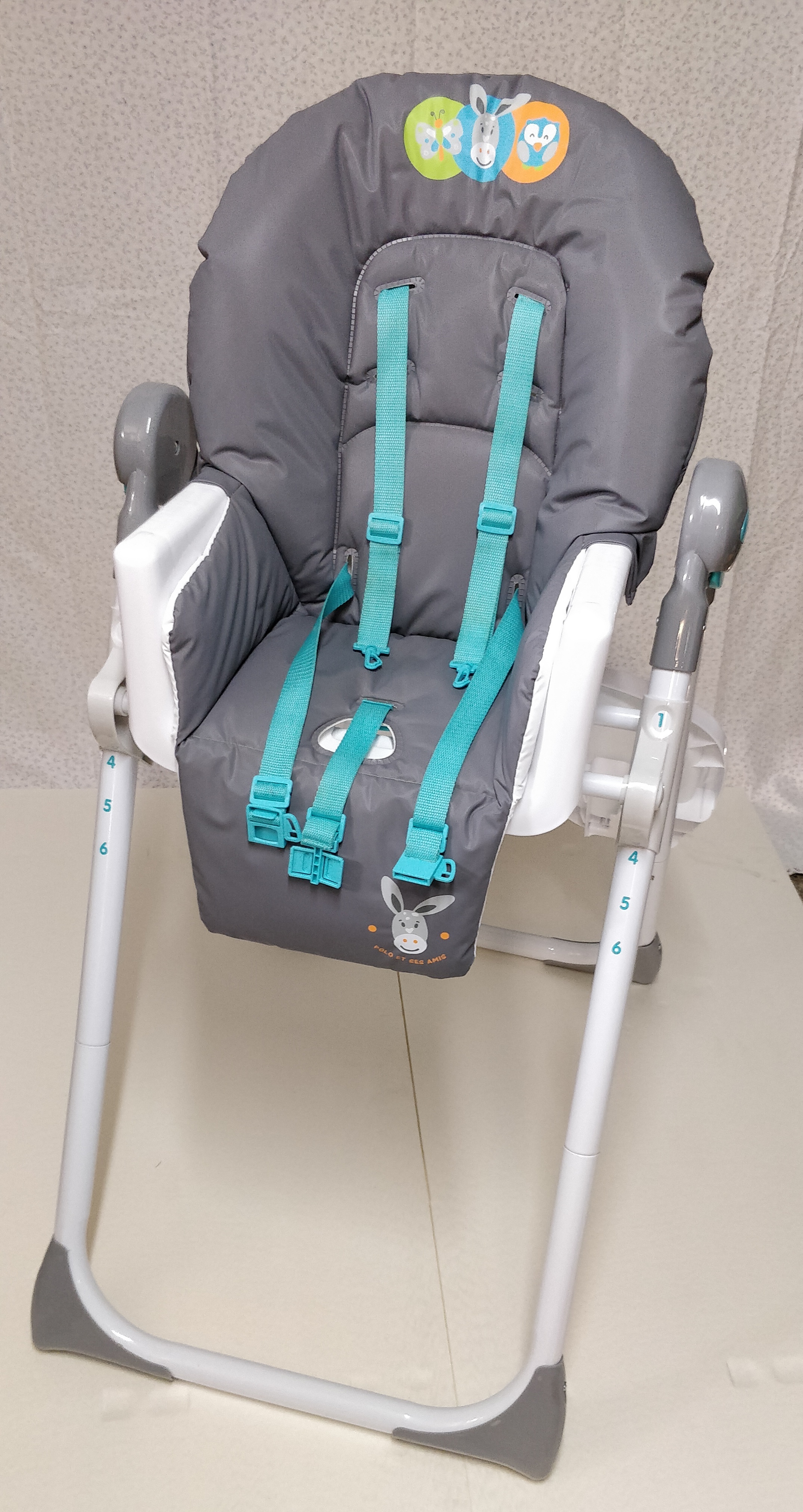 1 Chaise haute multiposition Bambikid couleur turquoise + gris (50 € neuf) pour 25 €.