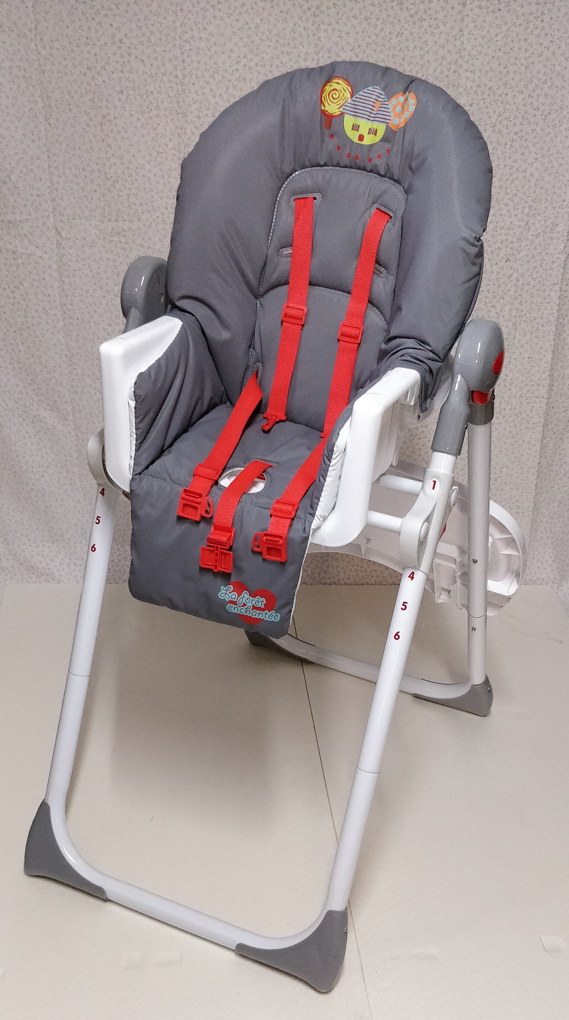 1 Chaise haute multiposition Bambikid couleur rouge + gris (50 € neuf) pour 25 €.
