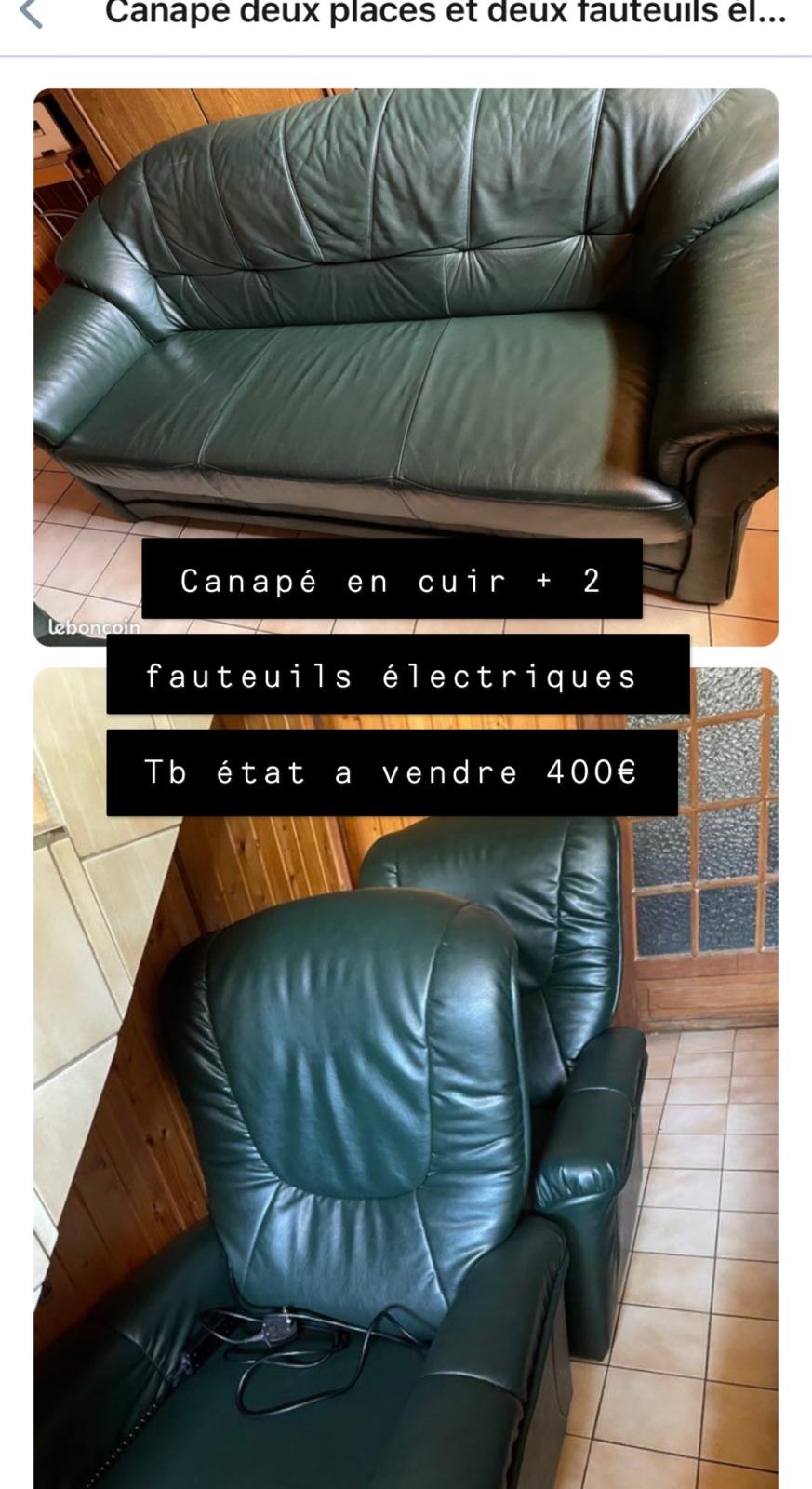 Un canapé et deux fauteuils électriques en cuir de vachette. Très bon état.