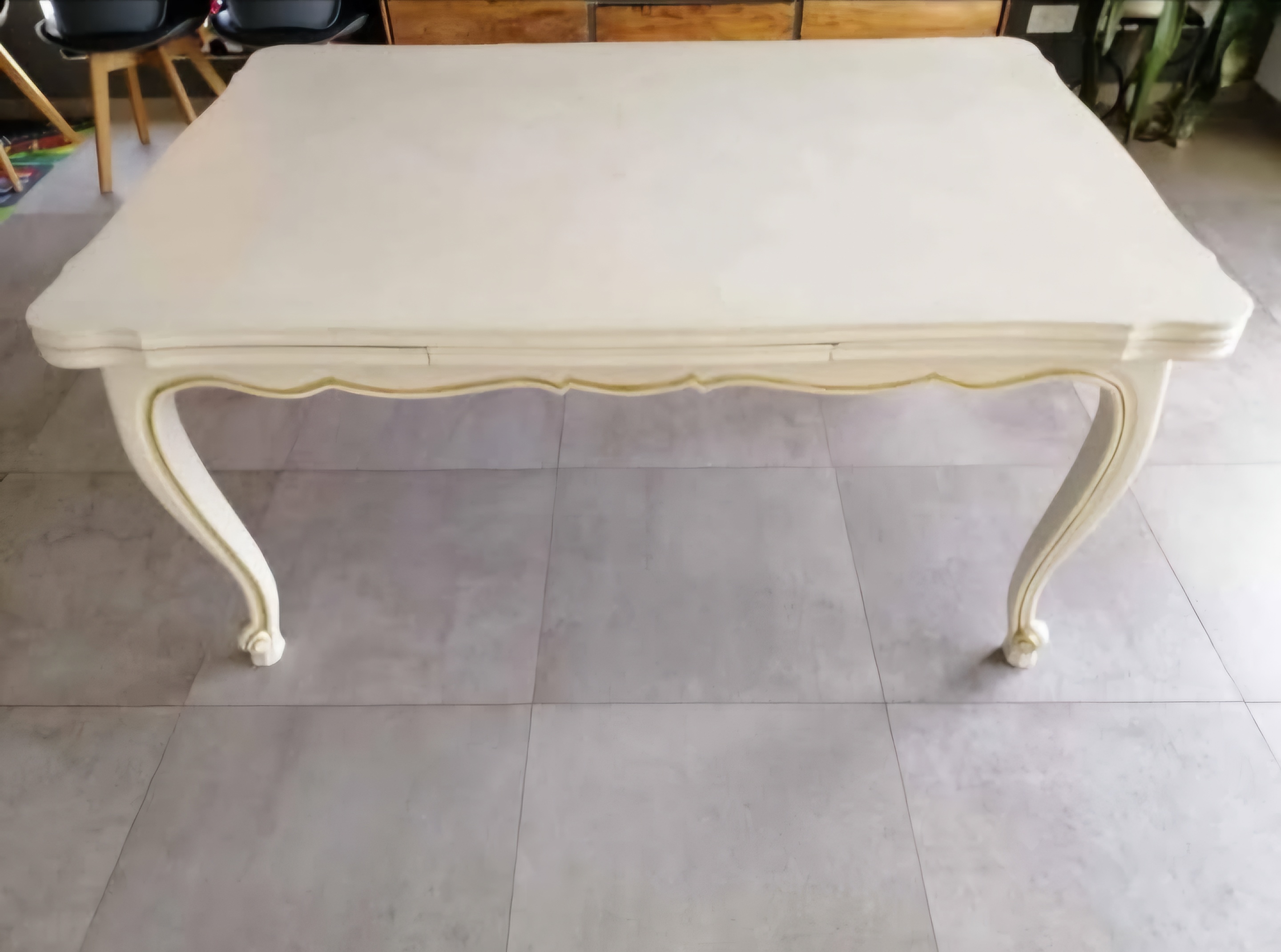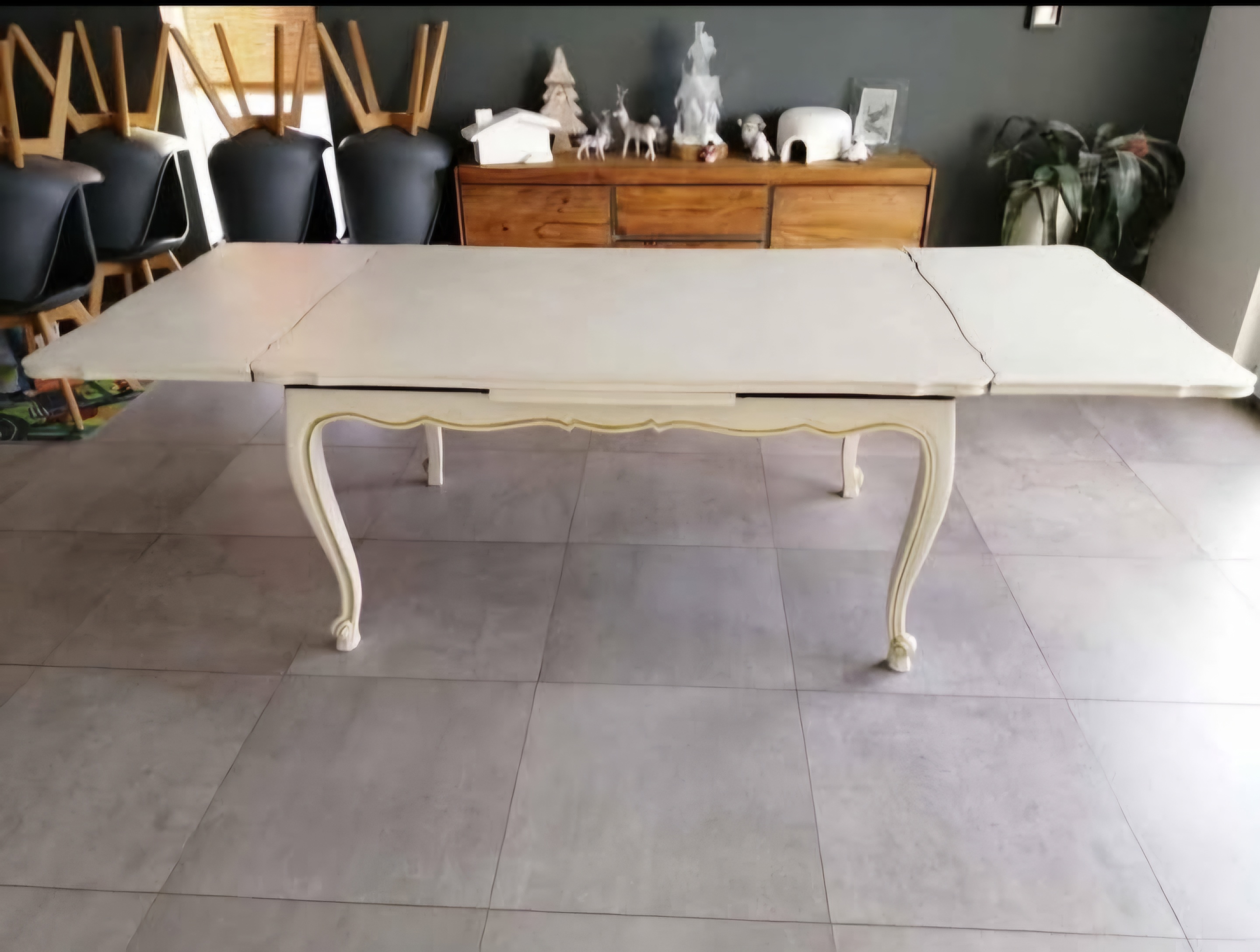 Cette table réalisée par un ébéniste présente les caractéristiques du style Louis XV, reconnaissable par ses pieds galbés, sa ceinture ornée de motifs sculptés discrets, et ses lignes élégantes. Les meubles Louis XV valorisent l’aspect décoratif.
