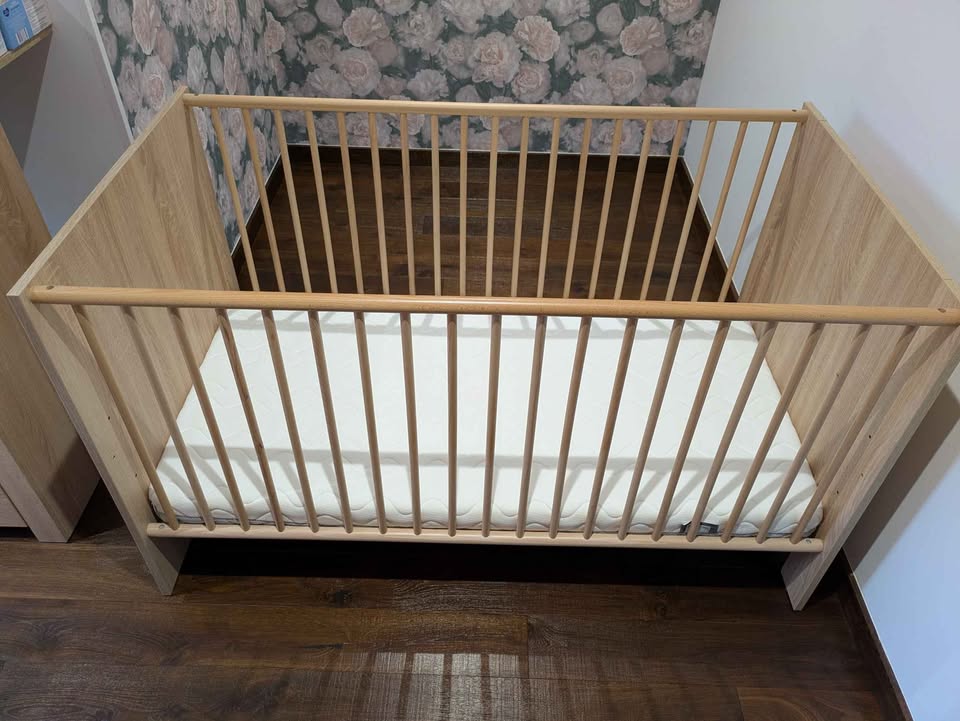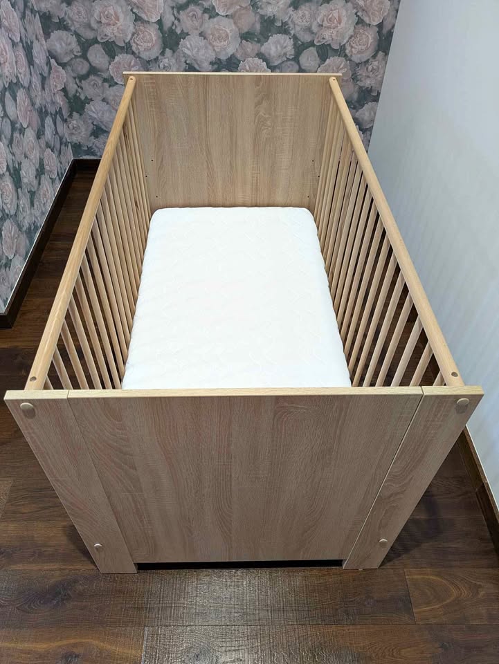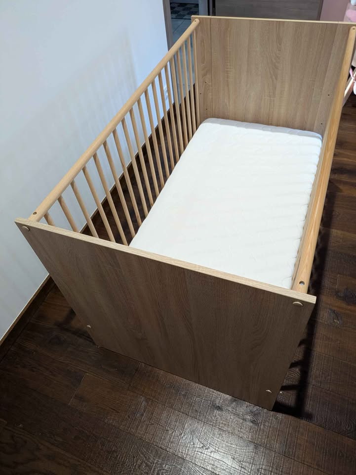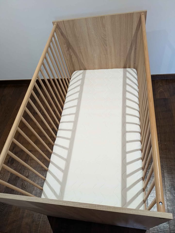 Lit bébé couleur chêne clair, excellent état comme neuf, avec matelas 70x140