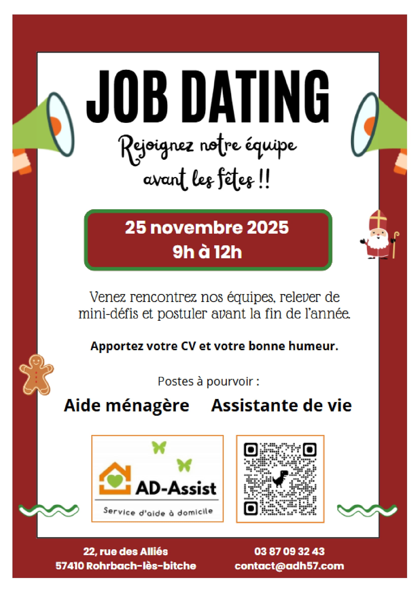 L'agence AD'ASSIST organise un Job Dating le mardi 25 novembre 2025 de 9h à 12h, dans ses locaux.