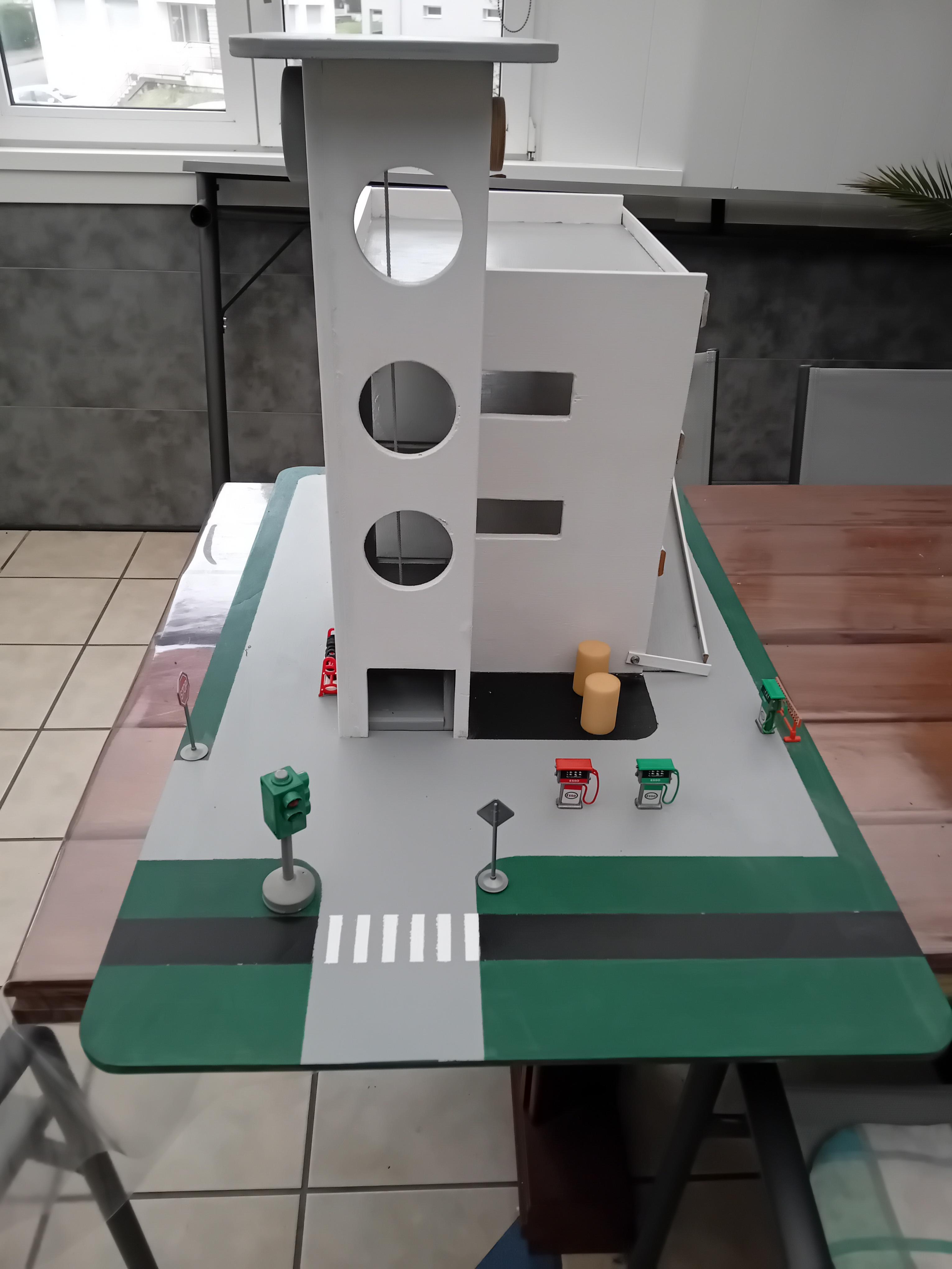 rampe d'accès avec station d'essence, station de lavage et pneus
