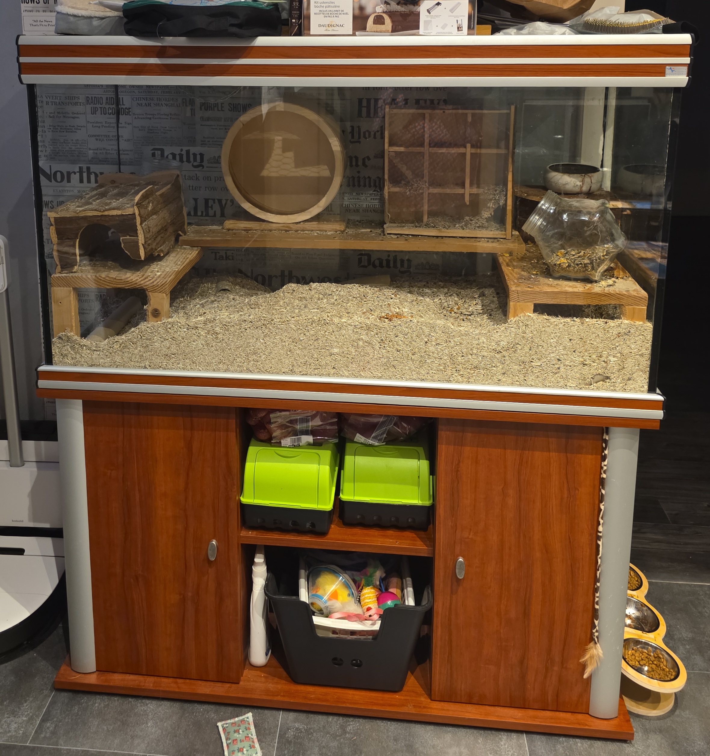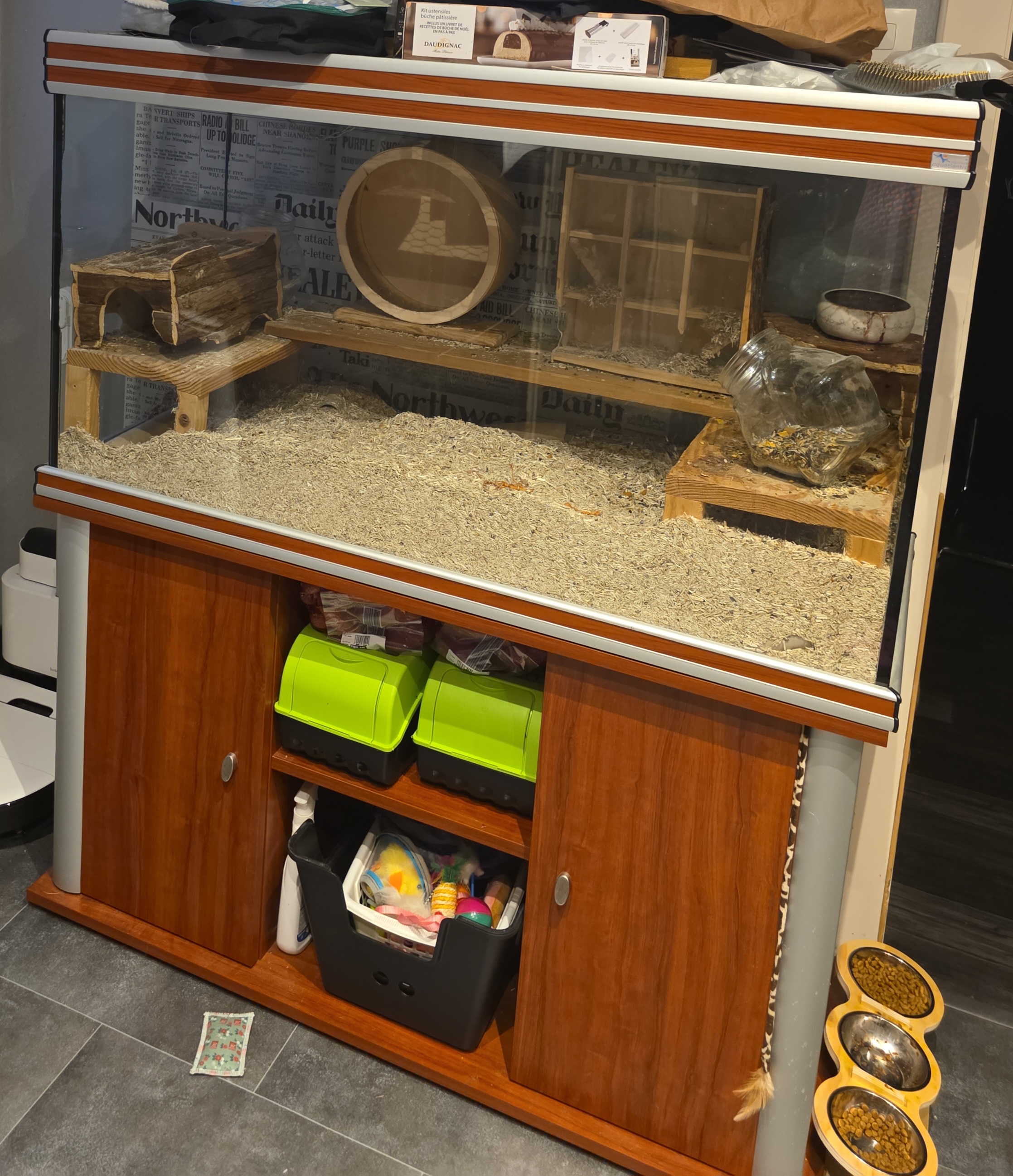 Vend aquarium servant de terrarium pour gerbille ou rongeurs... pas possible d'utiliser pour des poissons car plus de couvercle. Est fermé avec un couvercle en grillage. Vendu avec meuble du dessous. Négociable dans la limite du raisonnable....Plus d'info en mp