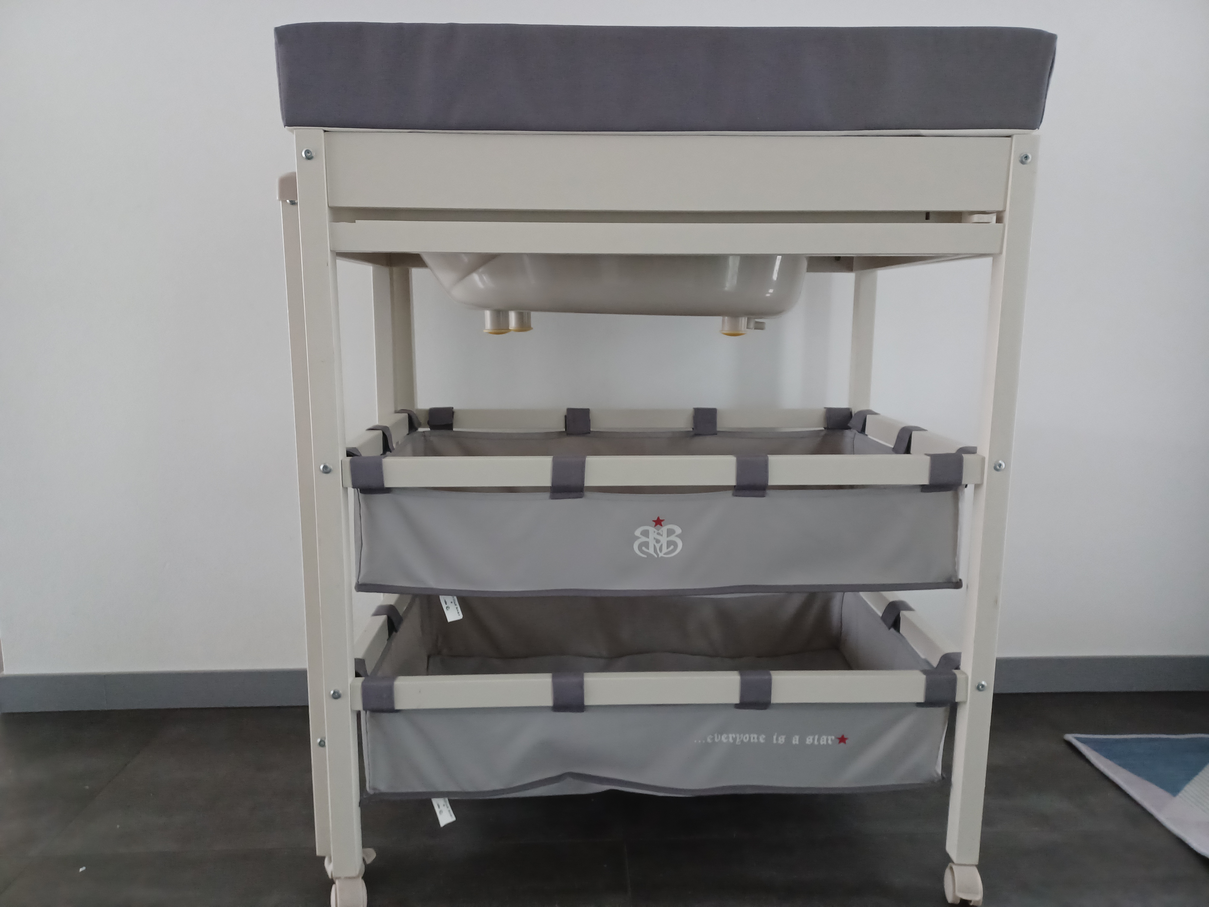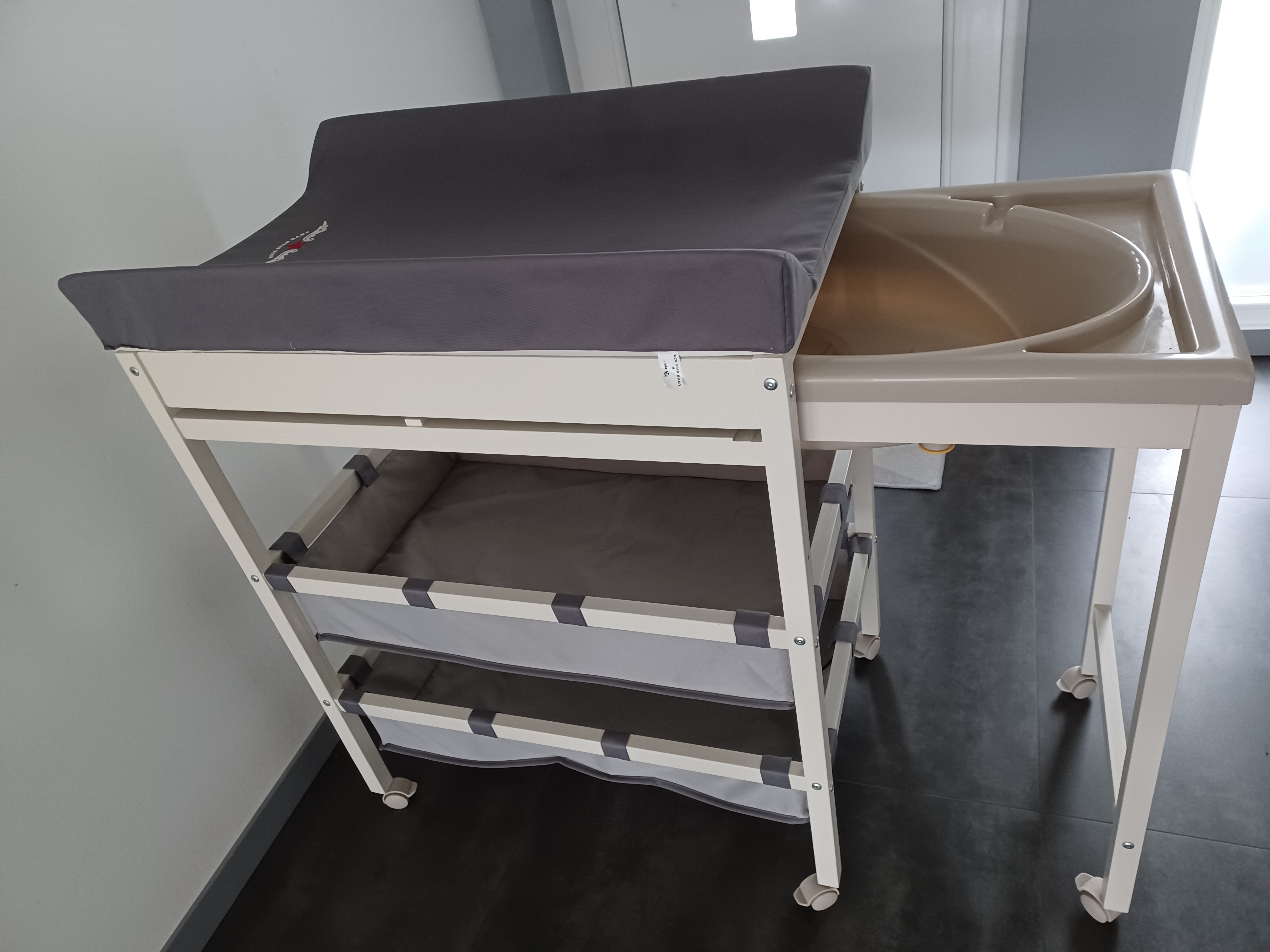 Très belle baignoire et table à langer roba "Rock Star Baby" en bois laqué blanc avec matelas à langer en gris foncé.La baignoire intégrée avec tuyau d'évacuation, le matelas à langer et les deux compartiments en tissu suspendus font de cette combinaison baignoire-table à langer un outil pratique, sécurisé et indispensable.