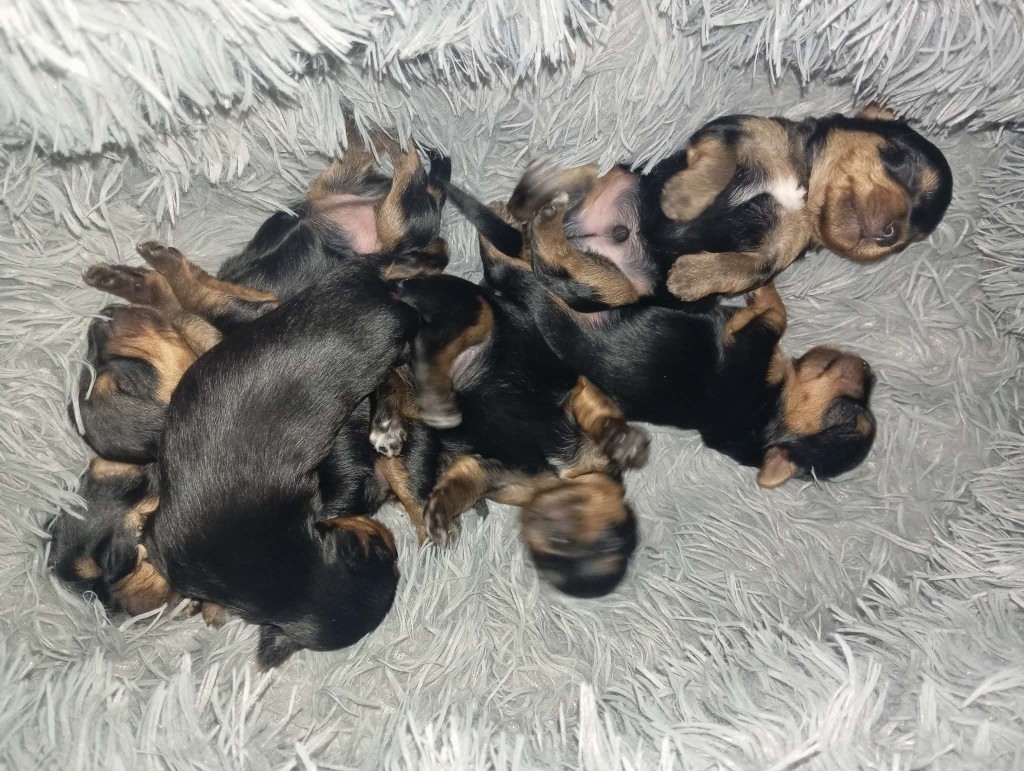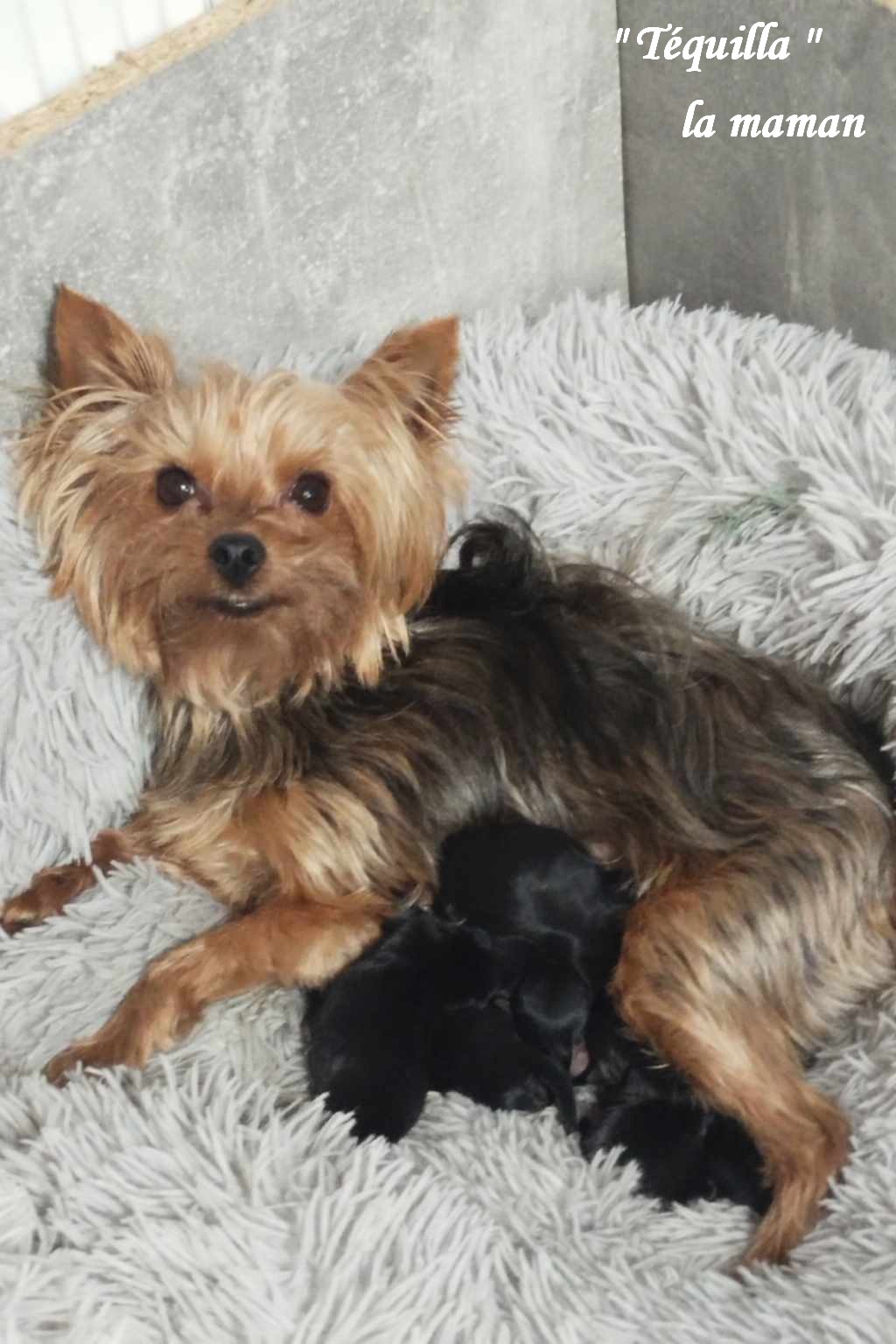 Nos 6 chiots Yorkshire Terrier noir et feu, nés le 30/12/2025, grandissent aujourd’hui au cœur de notre foyer, entourés de présence humaine et de leurs parents, visibles au domicile.