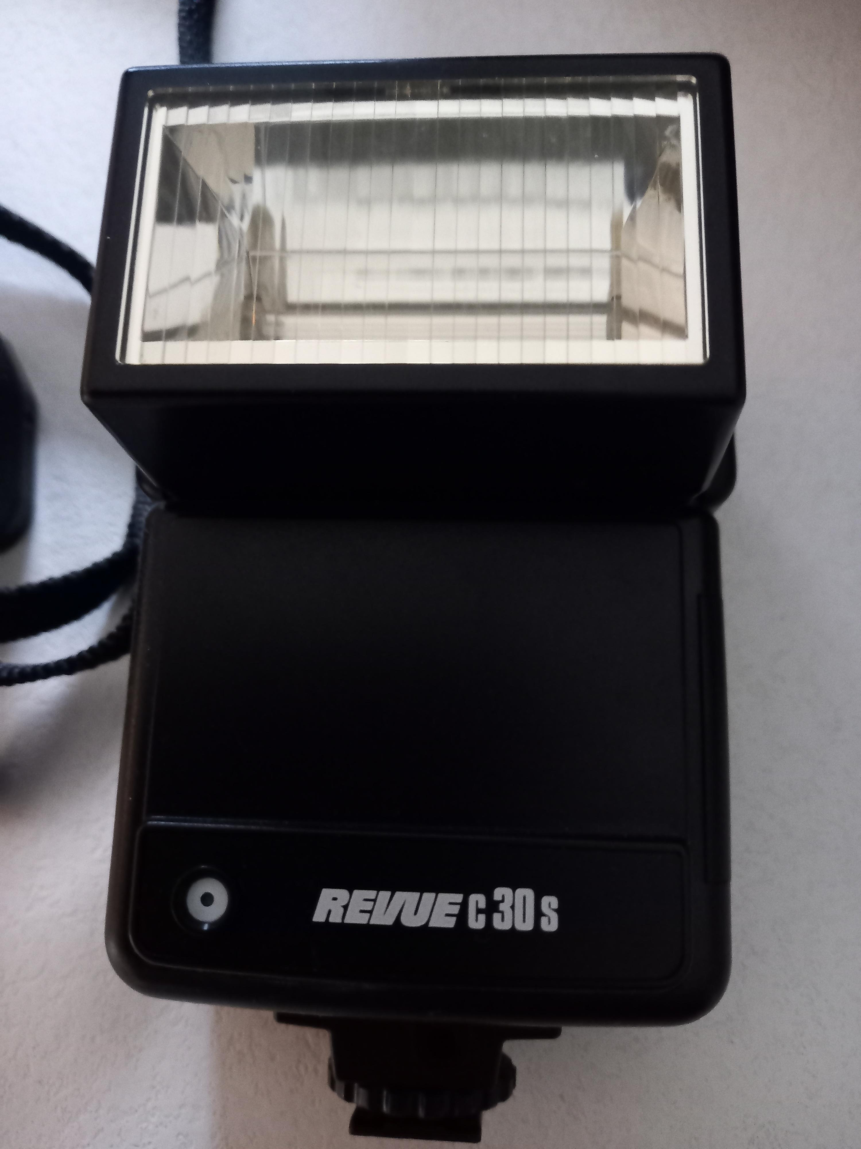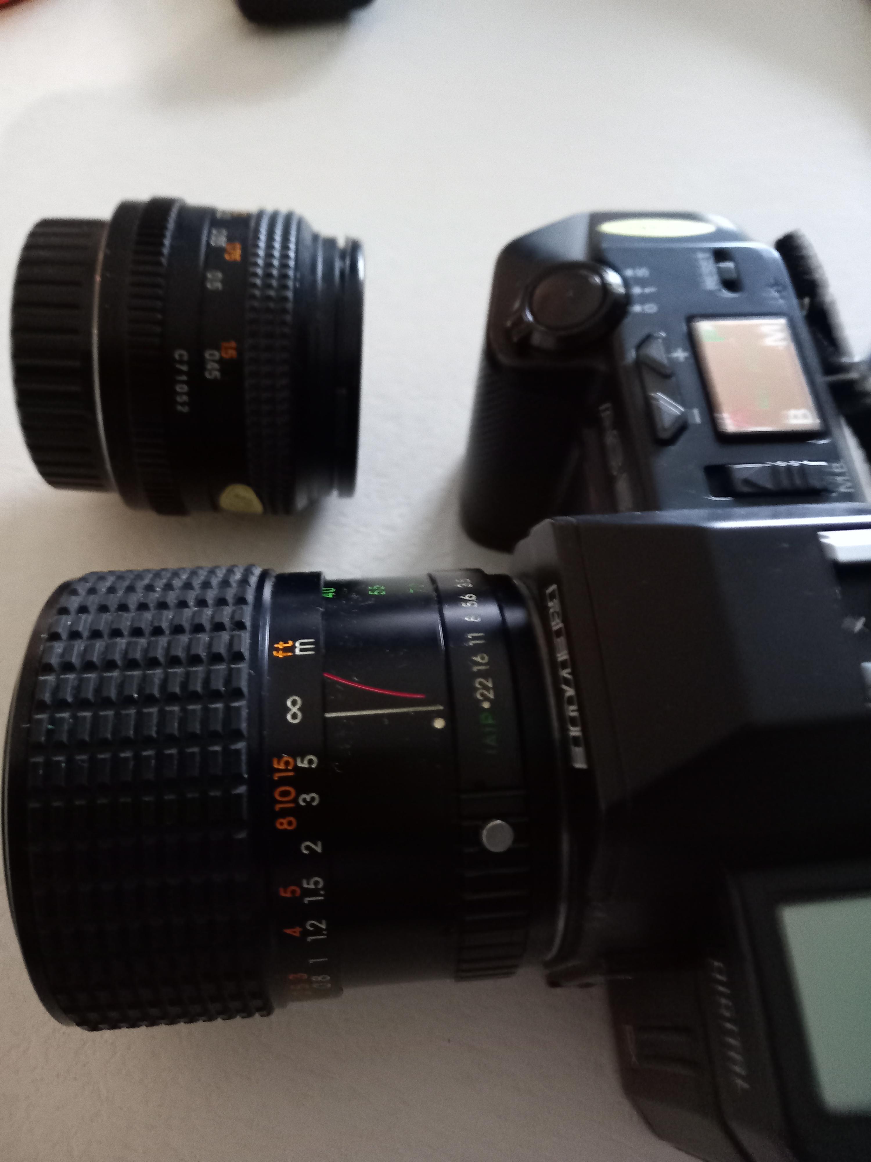 Appareil photo argentique, bon état, comprenant deux objectifs, un flash et coffret de rangement.