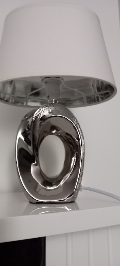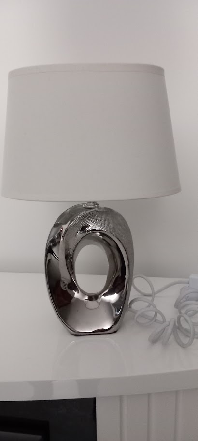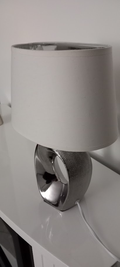 Lampe d'appoint sur un pied original et moderne de couleur argentée d'une hauteur de 33 cm, état neuf avec son chapeau et ampoule.