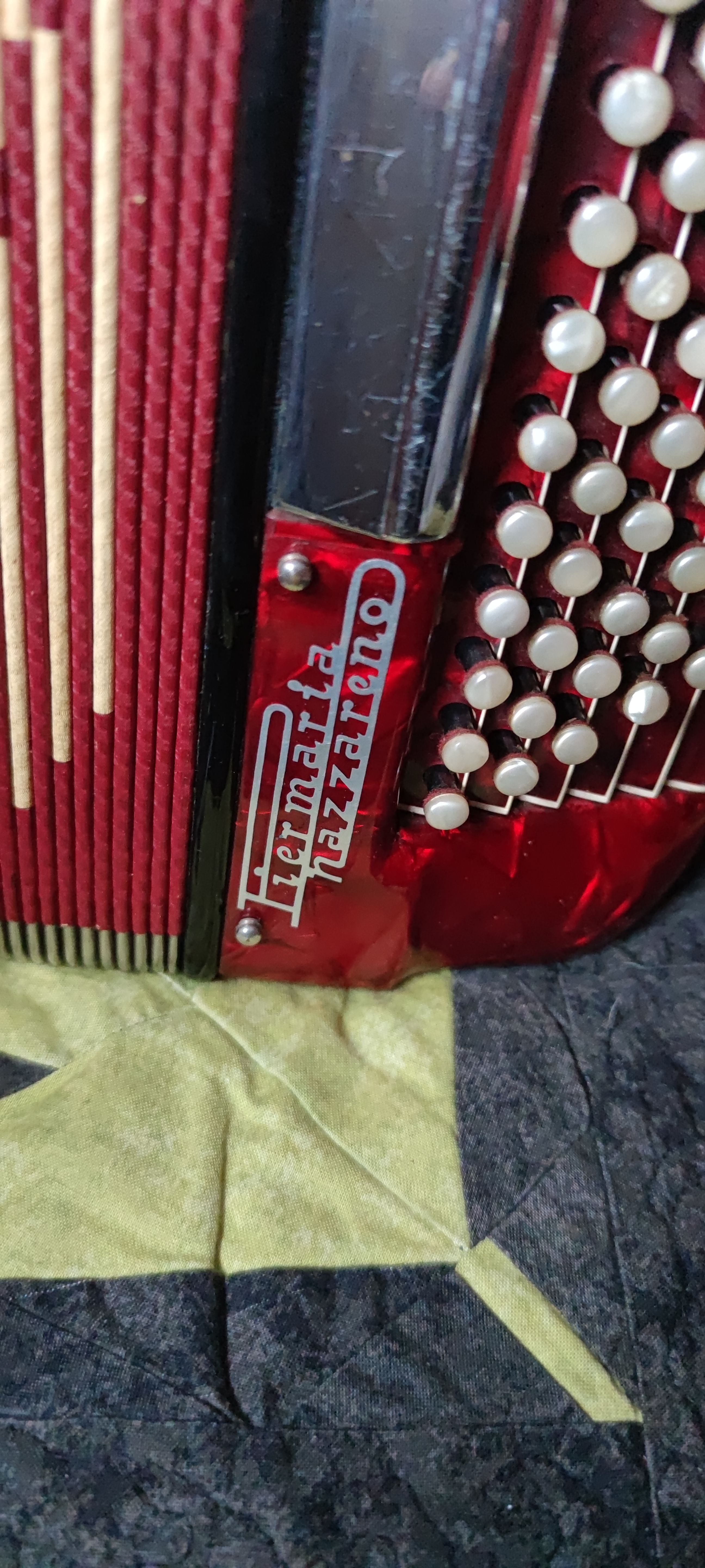 Accordéon à boutons dont deux fausses notes, un 120 basses et avec 4 rangées a droite ; très bon état