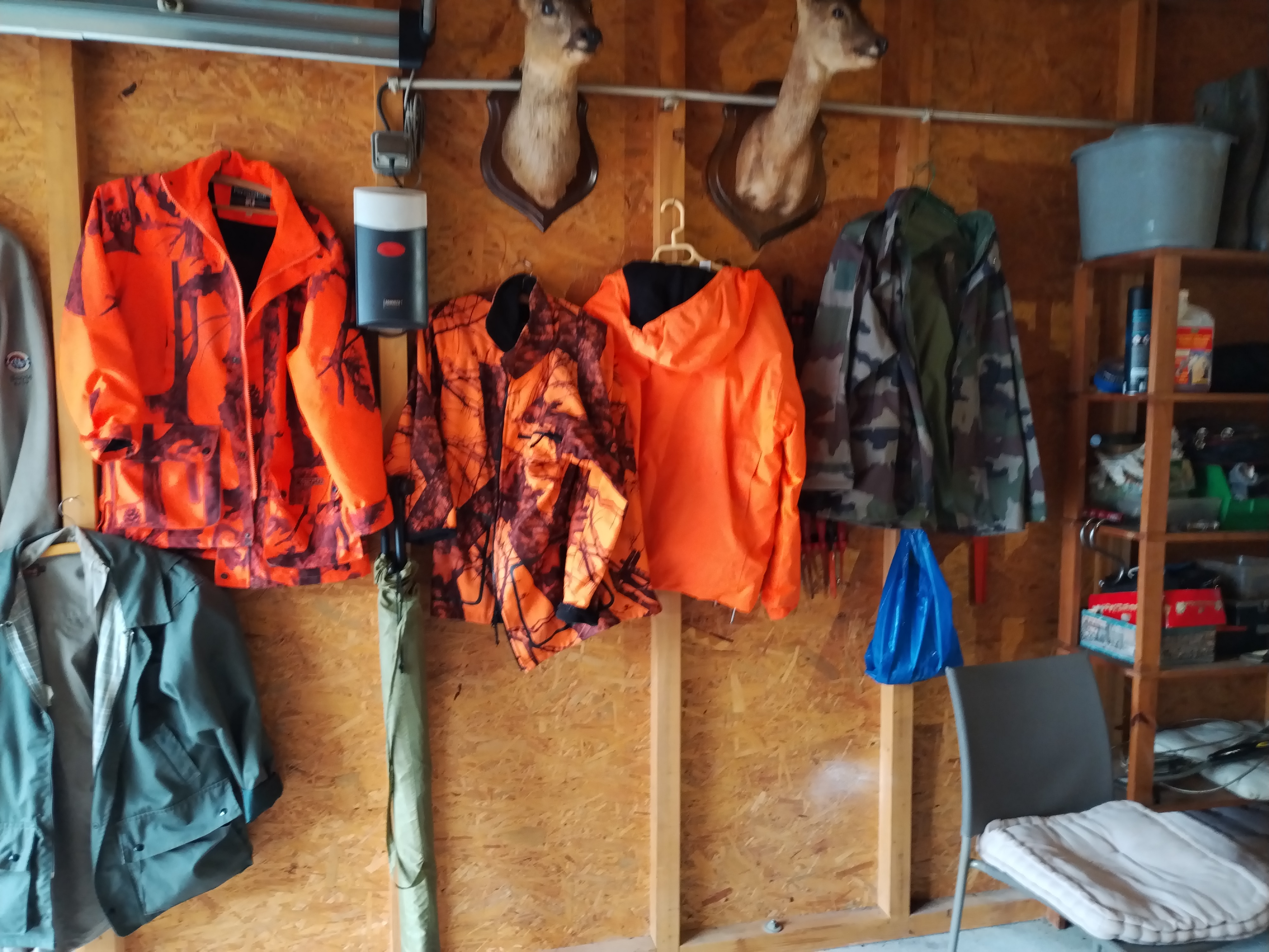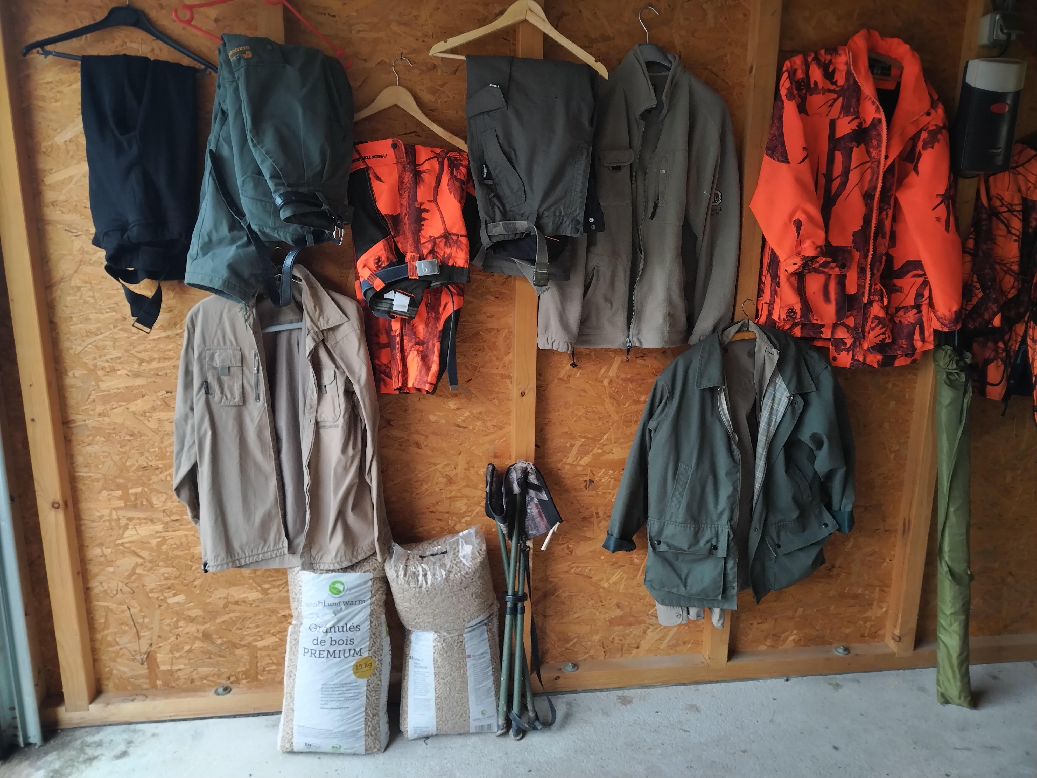 Vestes, pantalons, chemises, siège de battue, parapluie battue, chaussures qualité en 40.