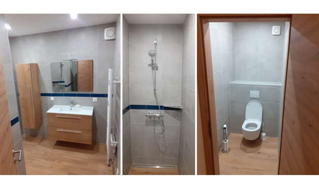 -une salle de bains refaite à neuf comprenant une douche à l’italienne, un sèche-serviette, un miroir, un meuble de rangement et un meuble-vasque, avec extracteur d’air,
