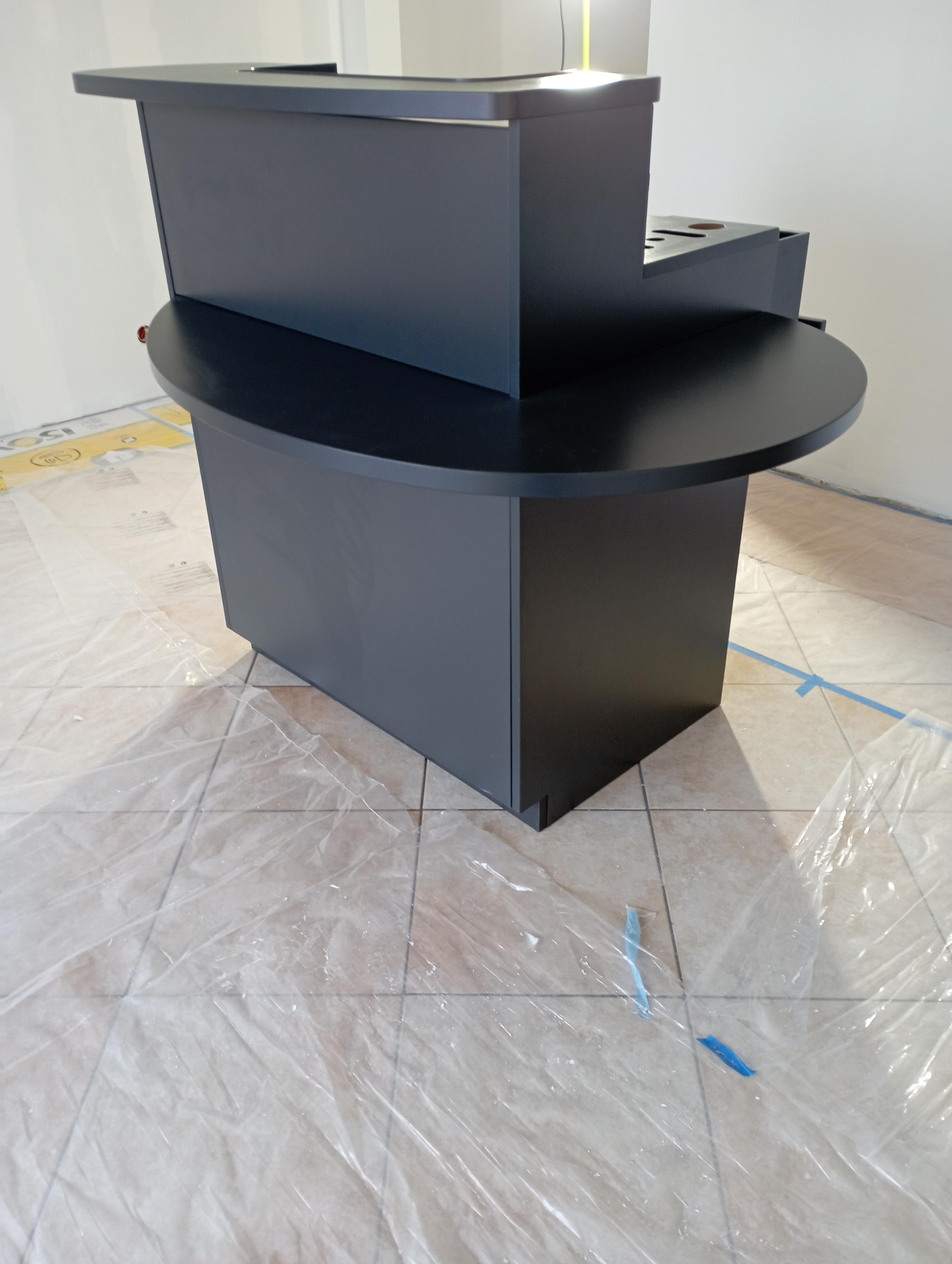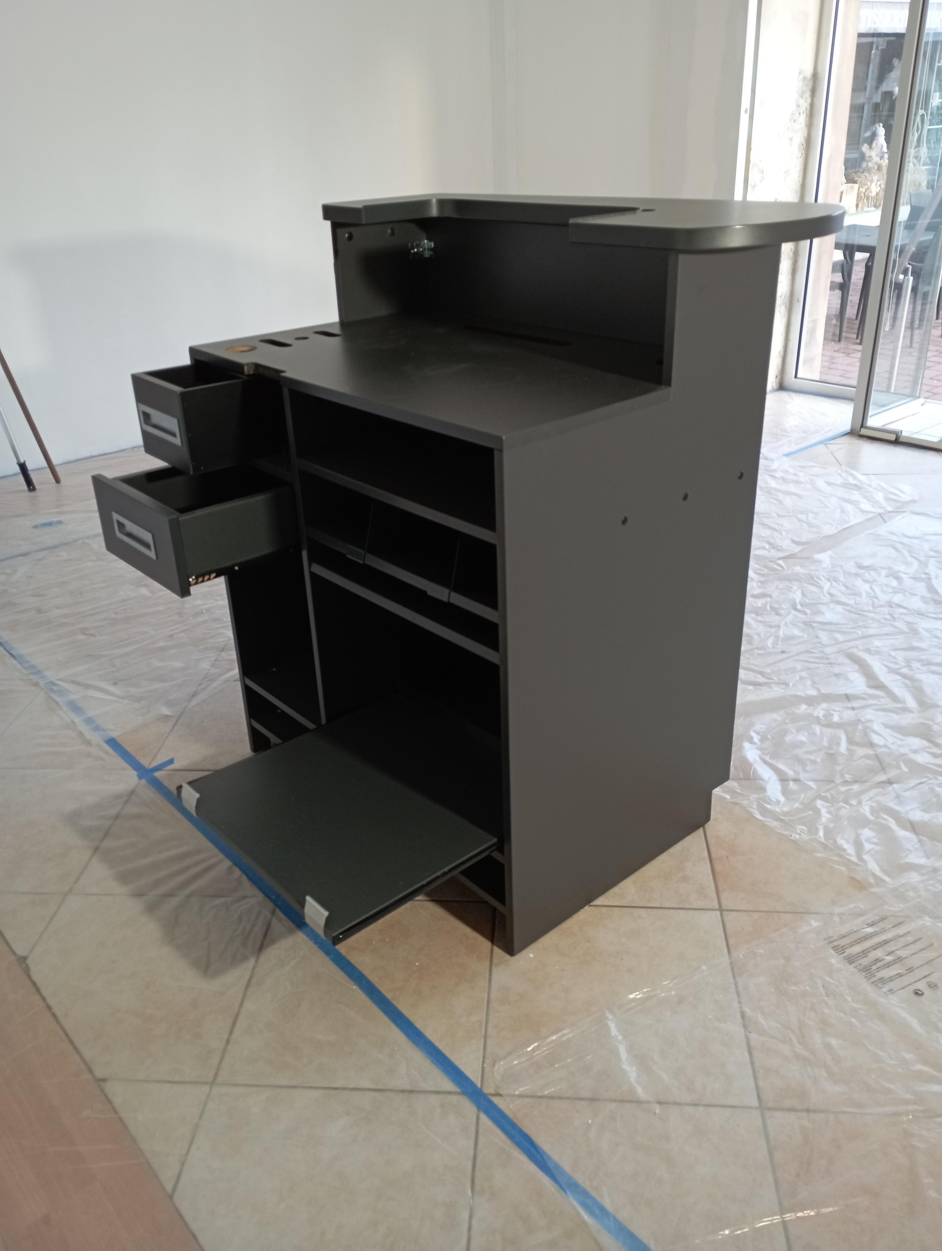 Comptoir de vente noir trés bon état environ 120 centimètres et 80 centimètres hauteur 90 centimètres et 120 centimètres pour la tablette accueil avec tablette pour informatique.
