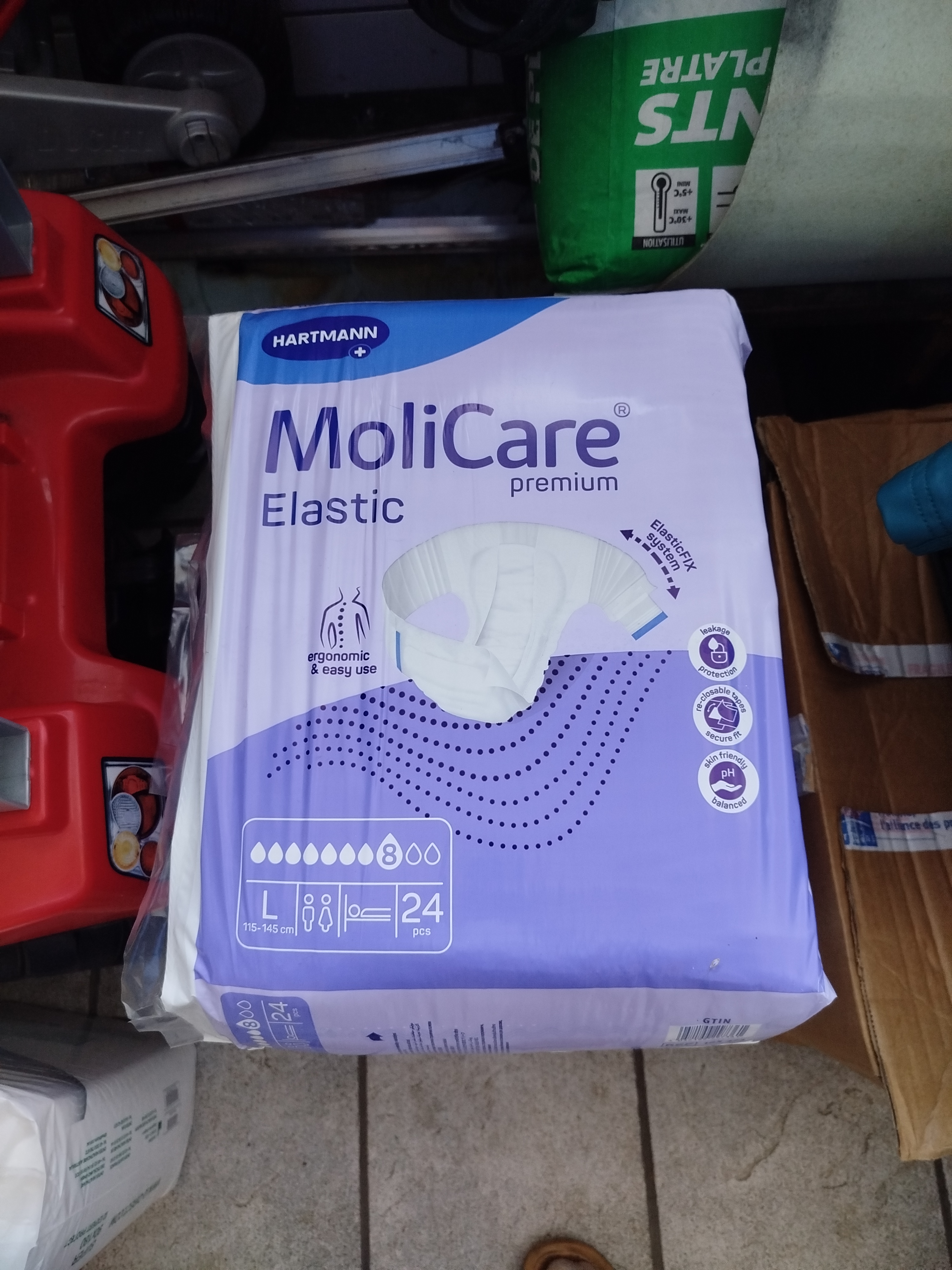 Donne 3 paquets de couches adultes Molicare Prenium élastic 8 gouttes taille L et un paquet d'alèzes dimensions 80x190