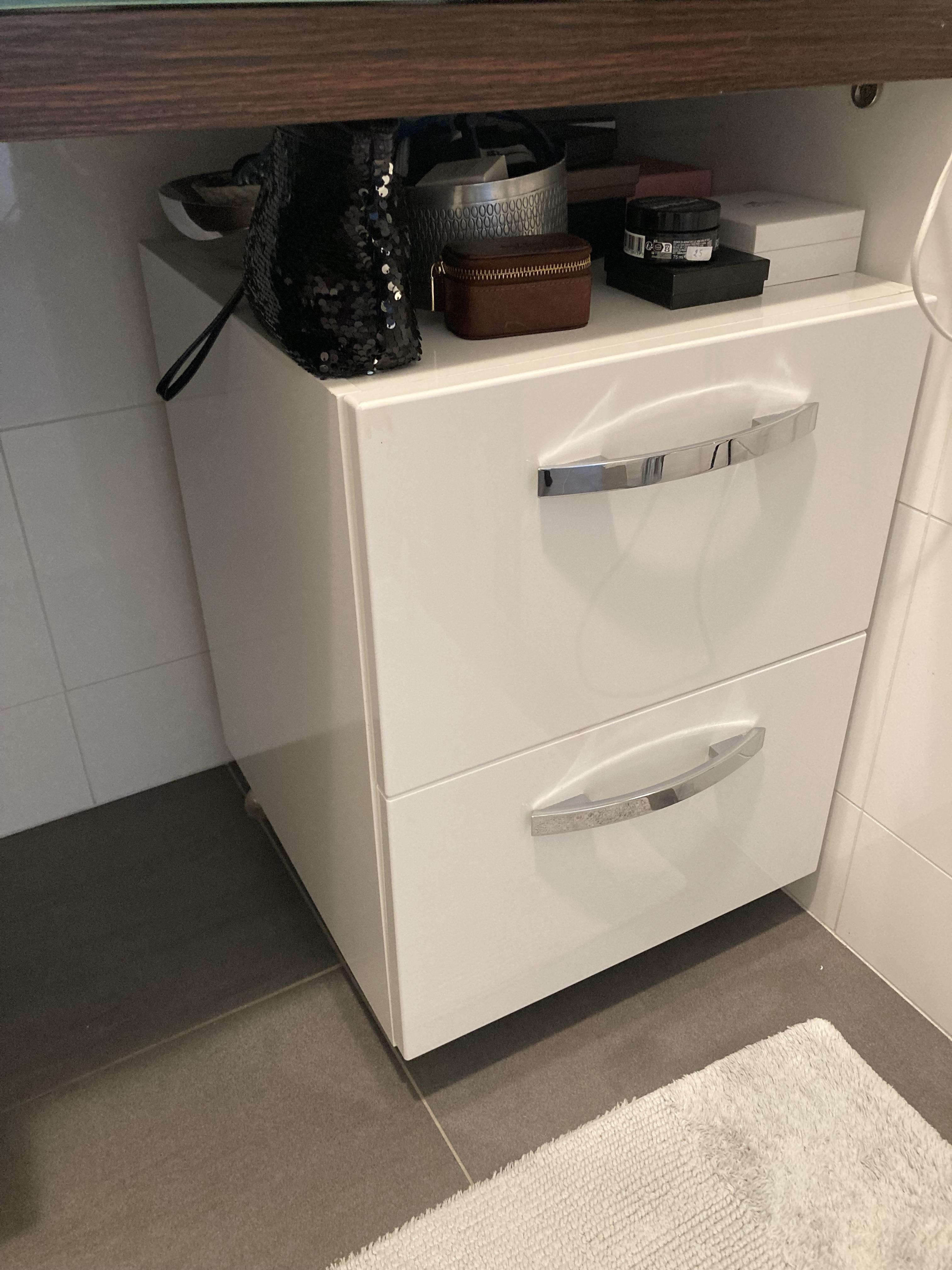 Petit meuble sur roulettes, blanc laqué, P 60 cm, H 55 cm, l 48 peut servir dans une salle bain , bureau, cuisine en très bon état.