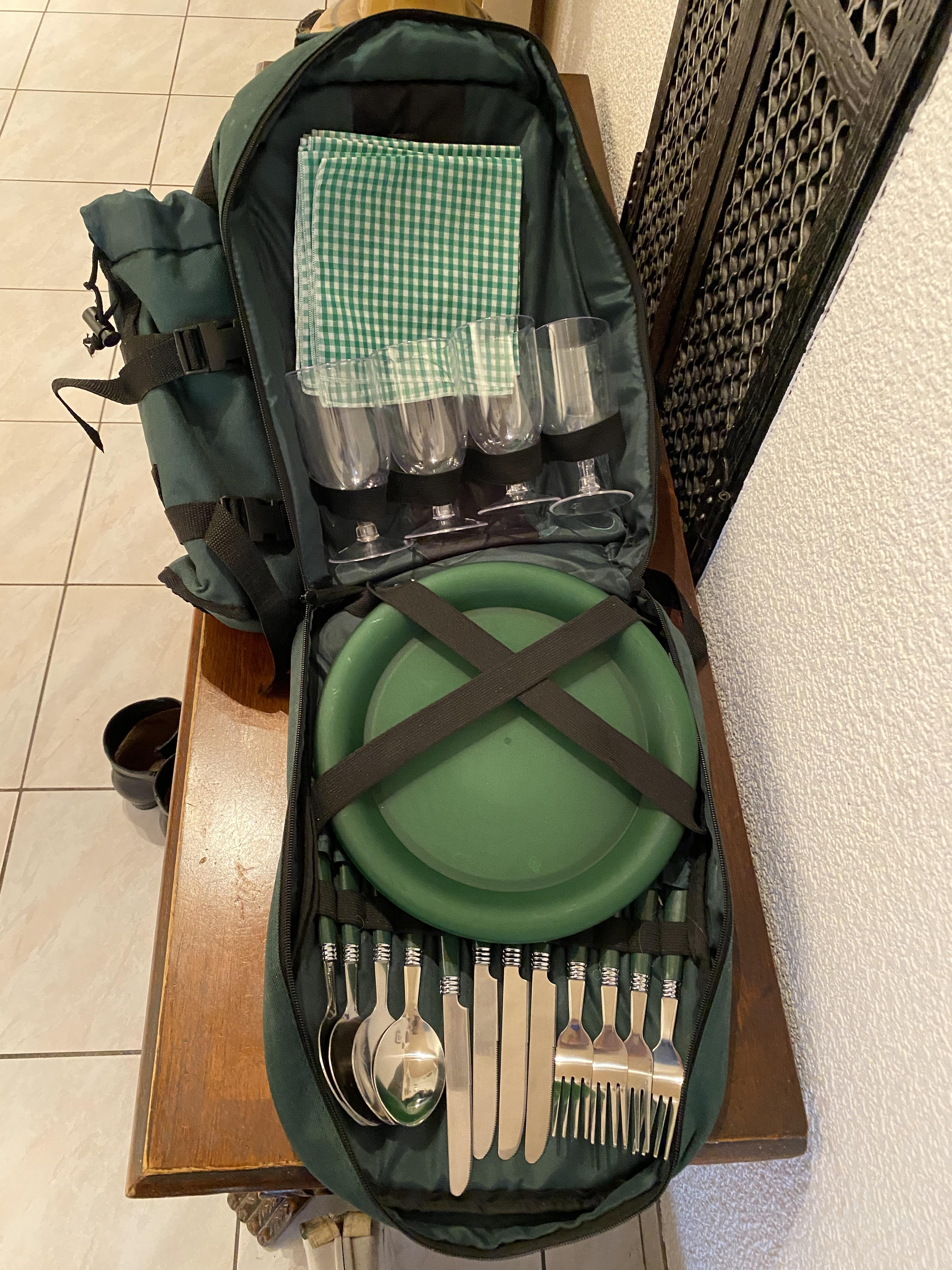 c'est à dire comprend assiettes,verres,fourchettes,couteaux,serviettes convient aussi pour les campings cars