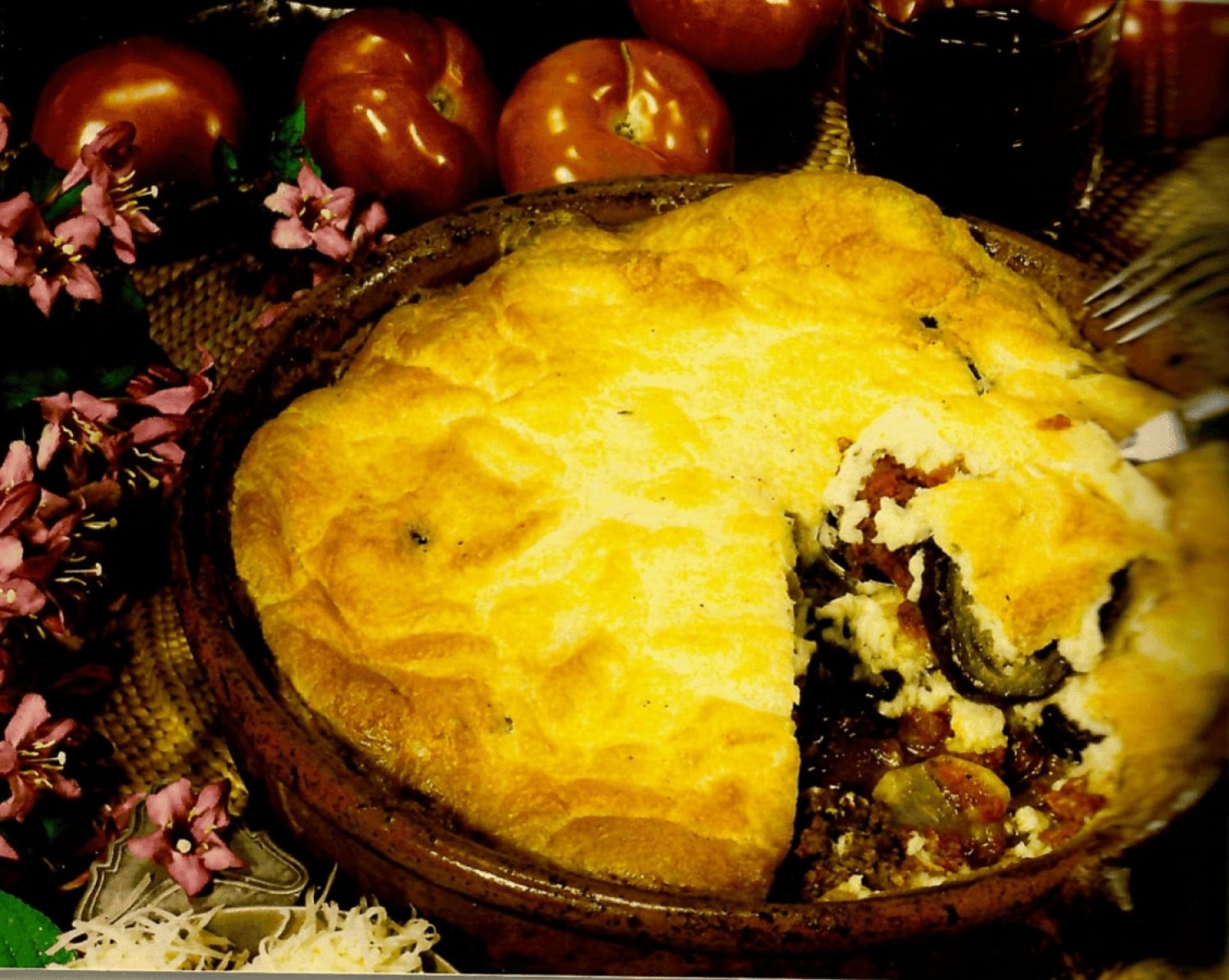 1 kilo d’aubergines, 1 oignon, 750 de viande hachée (du mouton de préférence, sinon du bœuf), ½ verre de vin blanc, 3 ou 4 tomates,2 œufs,75 grammes de fromage râpé, 2 cuillers à soupe de farine, 75 grammes de beurre, 2 cuillers à soupe de chapelure, sel, poivre, persil, 1 verre de lait, de l’huile d’olive.