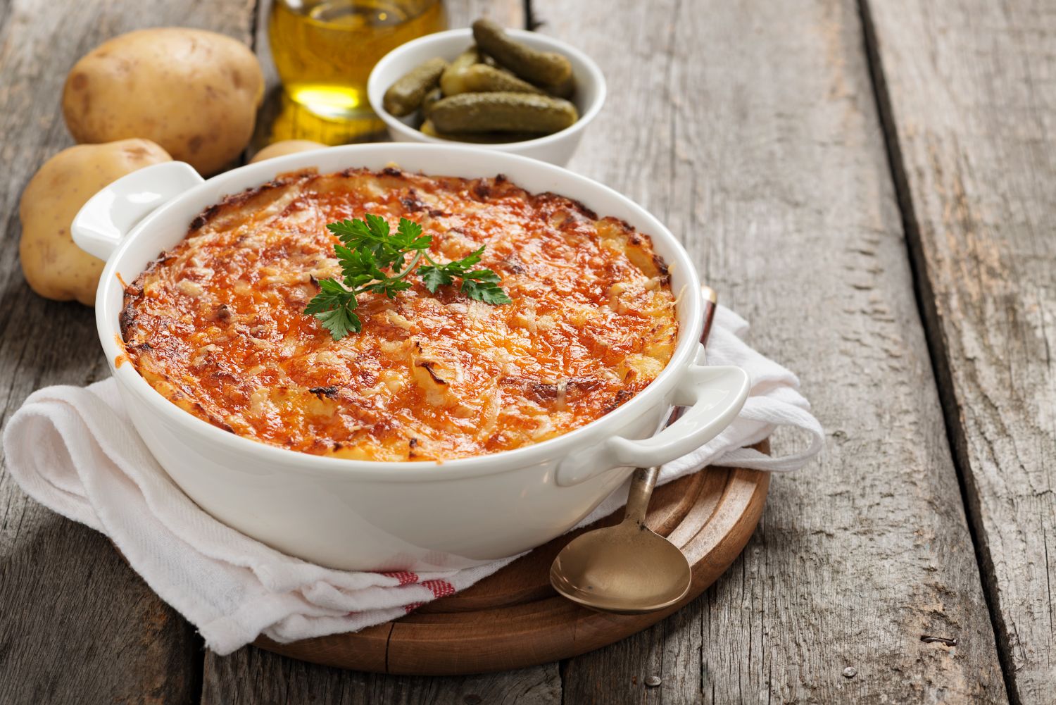 Déposez une couche de préparation au fond, puis la moitié des lamelles de gouda. Recouvrez avec une autre couche de pommes de terre, puis le reste du gouda.