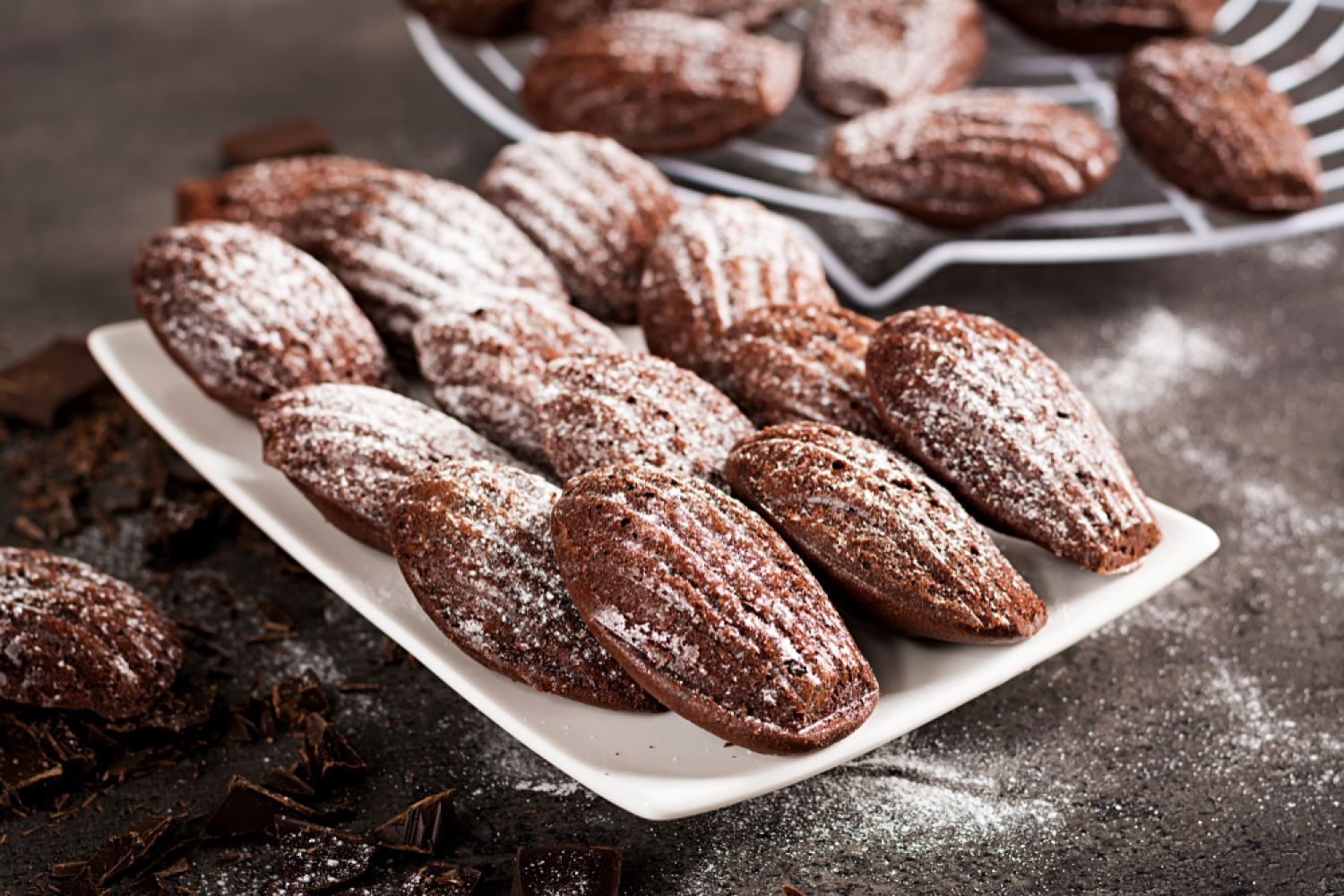 Répartissez-la dans le creux de moules à madeleines bien beurrés, enfoncez un carré de chocolat au centre de chacun, tout en le recouvrant d’un peu de pâte. Enfournez et laissez cuire 8 min.