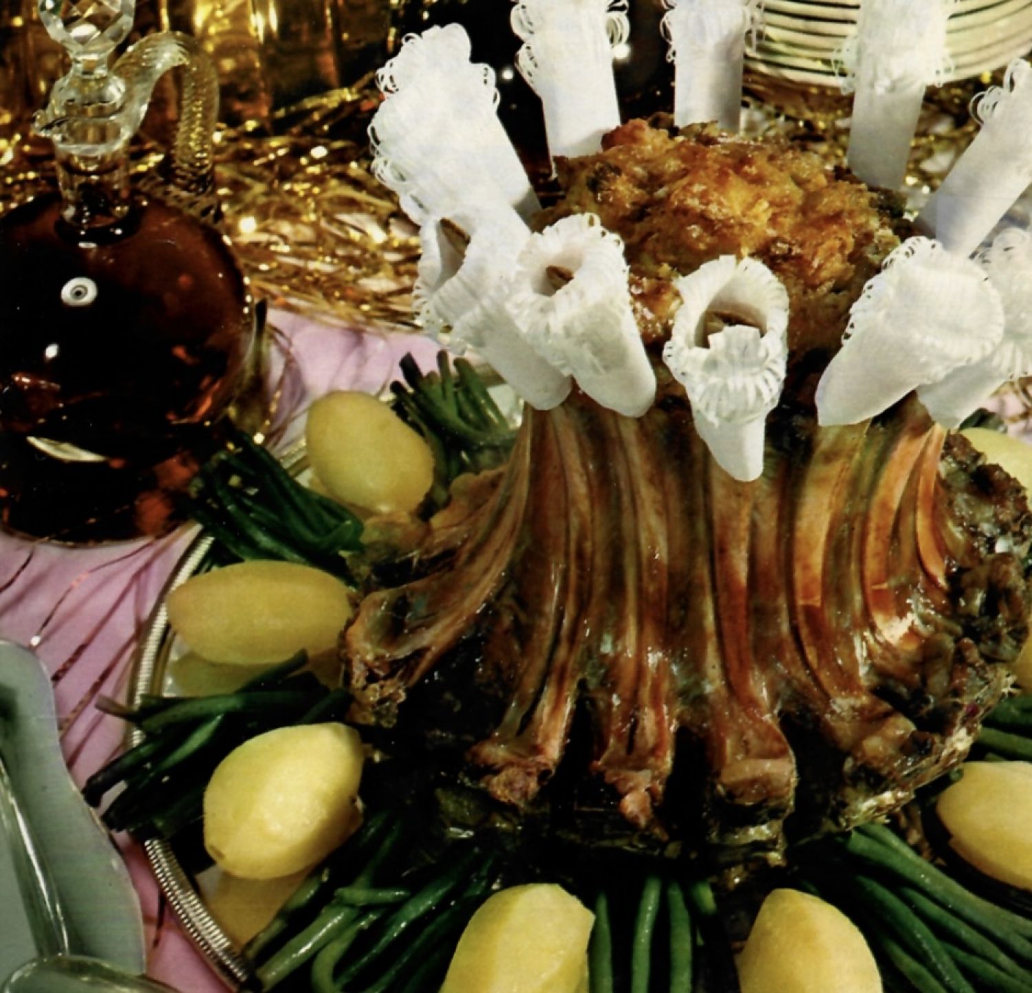 Préchauffer le four à 180° et préparer la farce pendant qu’il chauffe : faire sauter les oignons hachés dans du beurre, les mettre dans une jatte dès qu’ils sont dorés. Ajouter la mie de pain trempée dans le bouillon ou le lait et essorée, les raisins secs, les abricots hachés grossièrement, 1 œuf entier, du persil haché, sel, poivre et cannelle. Manier bien le tout afin d’obtenir une farce homogène et un peu grumeleuse. Saler et poivrer l’intérieur et l’extérieur de la couronne d’agneau, la remplir de farce et la poser sur une plaque ou un plat à rôtir. Enfourner et faire cuire en comptant 30 minutes de cuisson par livre de rôti, farce comprise. Disposer quelques coquilles de beurre sur la farce à mi-cuisson.
