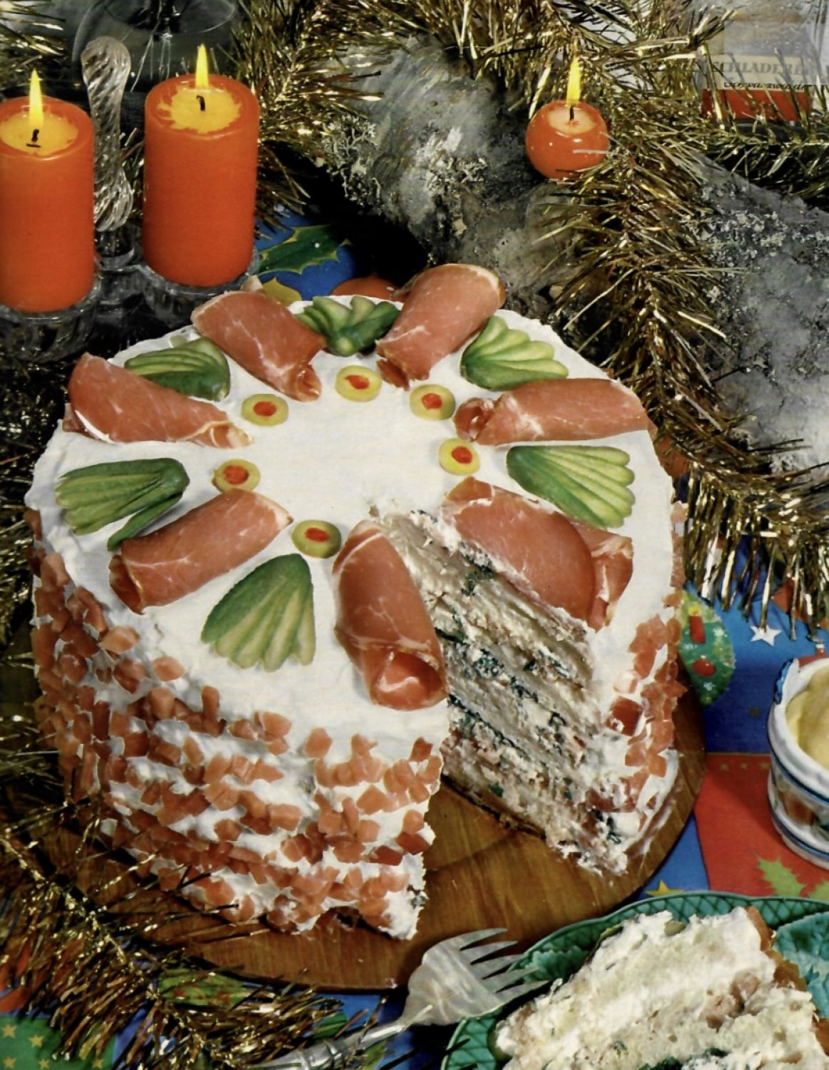 Supprimer la croûte du dessus et des côtés du pain, seul le fond doit rester. Couper le pain horizontalement en tranches bien régulières épaisses de 1, 5 cm environ afin d’obtenir un pain cylindrique lorsqu’il sera reconstitué. Replacer les tranches les unes sur les autres en intercalant successivement une épaisse couche des différentes préparations au fromage blanc. Ne pas tartiner la dernière tranche mais enduire tout le gâteau d’une bonne couche de fromage blanc légèrement salé et poivré. Hacher les tranches de jambon de campagne en tout petits cubes, en garnir le tour du gâteau. Décorer le dessus de cornichons taillés en éventail, de tranches de bacon roulées et de rondelles d’olives. Garder au frais jusqu’au moment de servir.