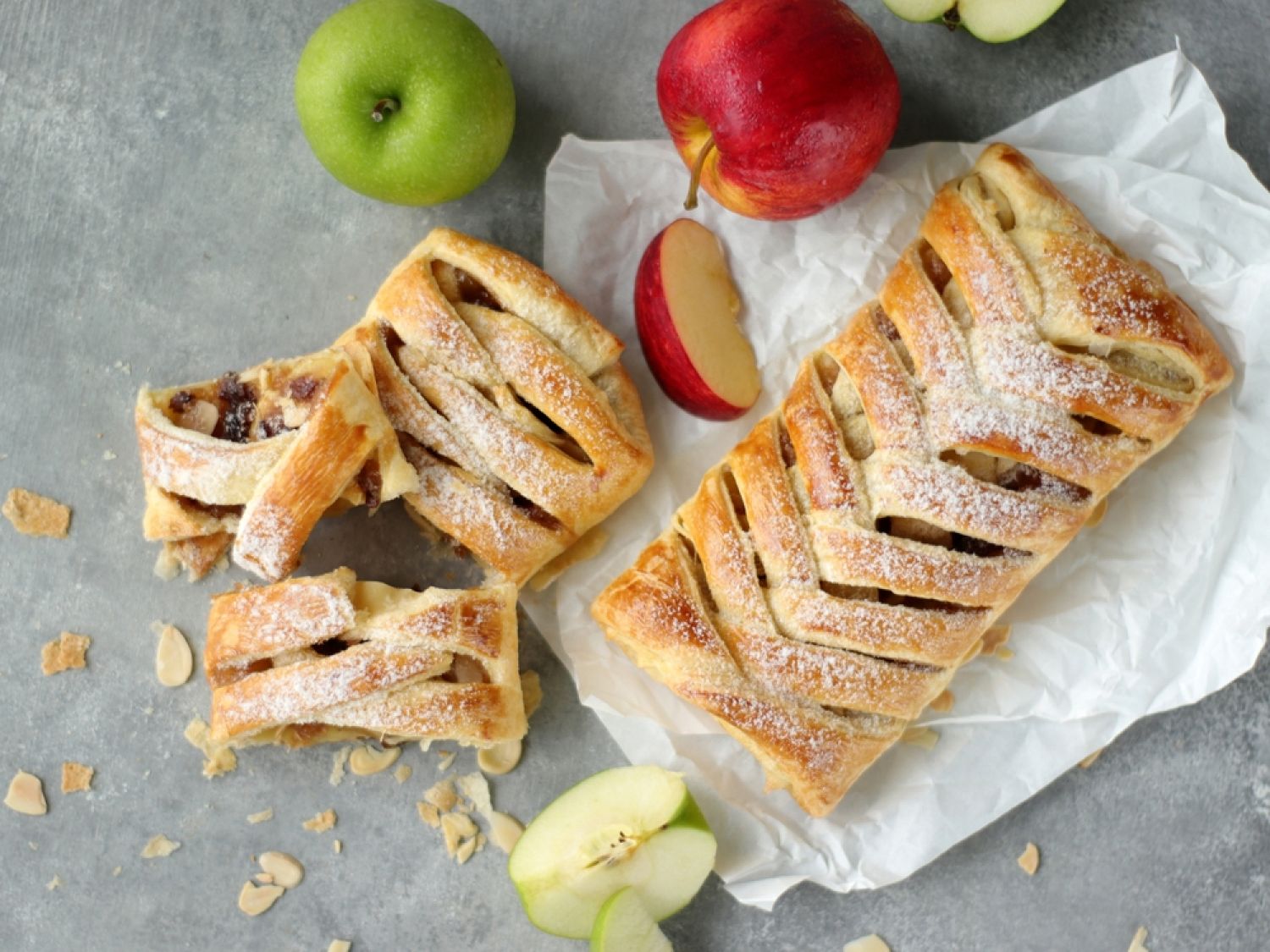 Déroulez la pâte feuilletée sur une surface plane et propre. Versez la préparation de strudel au centre de la pâte, en formant un rectangle en laissant environ 2 cm d'espace le long des bords. Puis, avec un couteau, taillez des bandes de part et d'autre. Rabattez-les en les croisant sur le dessus.