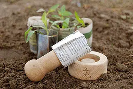 Saviez-vous que vous pouviez faire vos semis dans de petits pots en papier journal ? La création de ces petits godets peut s’avérer même très ludique pour de jeunes enfants qui n’auront plus qu’à planter la petite graine. Ce kit de plantation, particulièrement élégant, est constitué d’une presse en bois et d’une notice simple pour les instructions. Lorsque les plantules sont prêtes pour rejoindre le potager, il suffit de les planter avec le pot en papier. Le papier journal se désagrège facilement sans aucun inconvénient pour le sol.