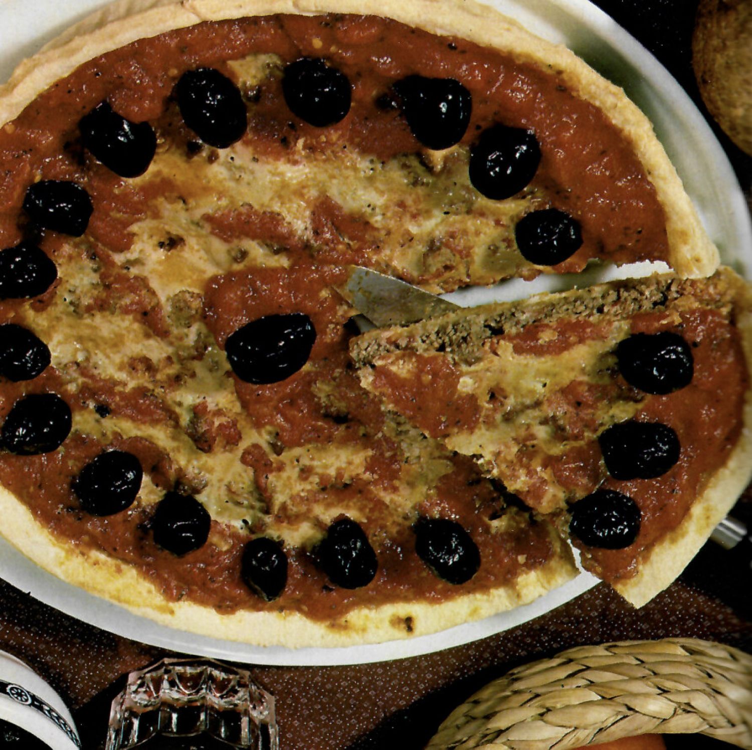 Garnir de pâte brisée un moule graissé. Y placer de fines lamelles de gruyère, poivrer et relever d’un peu de muscade râpée. Mettre la viande hachée dans une jatte et la mélanger avec l’œuf, du poivre, du sel, un peu de thym et du beurre fondu. Placer ce mélange sur la couche de gruyère et recouvrir de fines lamelles de gruyère. Enfourner à 225° pour une précuisson et préparer pendant ce temps la sauce : couper en morceaux les tomates pelées et épépinées puis les faire fondre dans un peu d’huile dans une casserole avec de l’ail, du laurier et du thym. Peu avant la fin de la cuisson de la tarte qui sera de 30 minutes, recouvrir celle-ci de la fondue de tomates en mélangeant un peu celle-ci au fromage fondu et pas encore durci du dessus. Terminer la cuisson et placer les olives noires 2 ou 3 minutes seulement avant de retirer la tarte du four. Servir bien chaud.