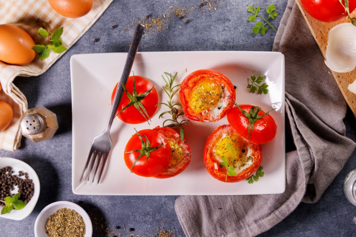 -Casse un œuf délicatement au-dessus de la farce dans chaque tomate.
