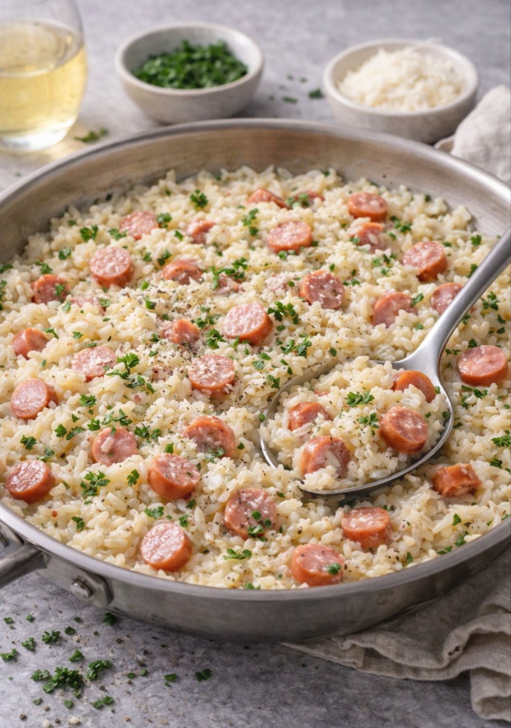 Au bout de 20 minutes de cuisson, ajouter les saucisses, le sel et le poivre. En fin de cuisson, ajouter le parmesan.